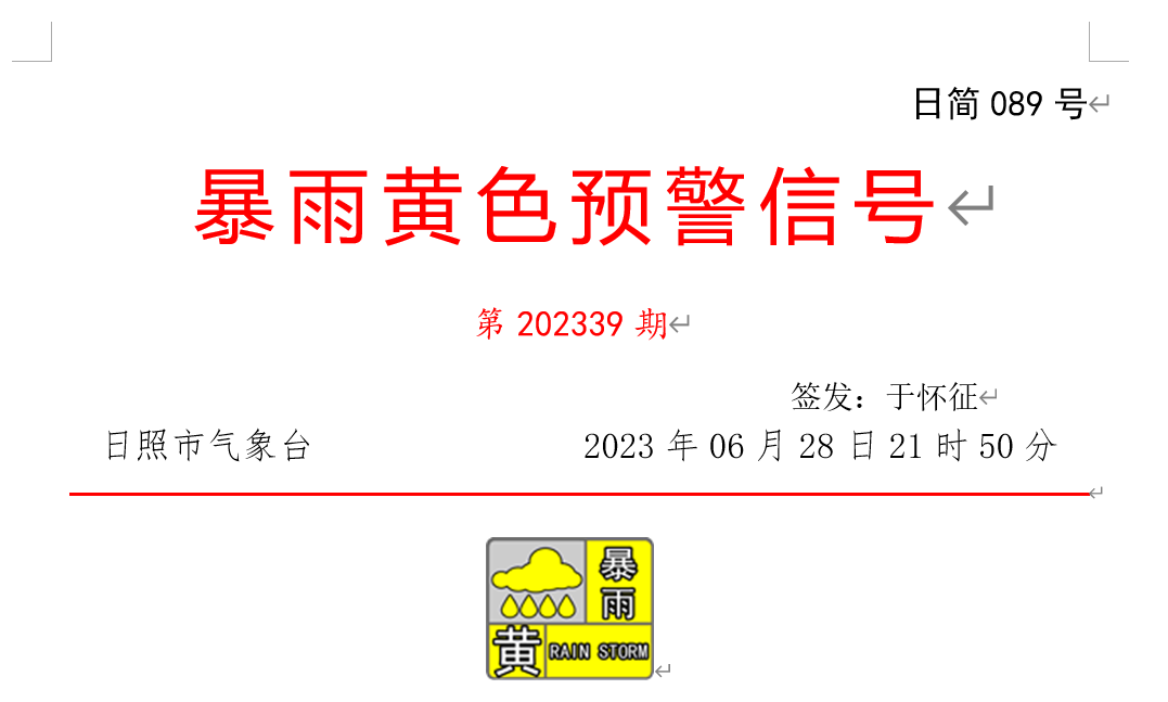 日照市气象台于2023年06月28日21时50分发布暴雨黄色预警信号。目前,我市莒县和五莲县的部分乡镇6小时降水量已超过50毫米。预计今天夜间到明天上午,我市的降水仍将持续。