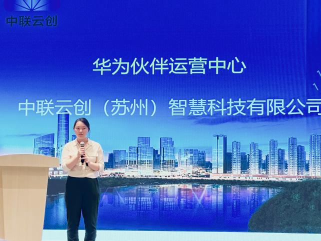中联云创总经理孟青青介绍了公司的主要优势。在成立华为伙伴运营中心后,中联云创团队建设秉承华为企业管理制度和文化,旨在打造一支实力强劲、战斗力十足的队伍。运营中心将继续运用双方优势,紧密配合,交叉合力,共同为客户提供全面的解决方案。