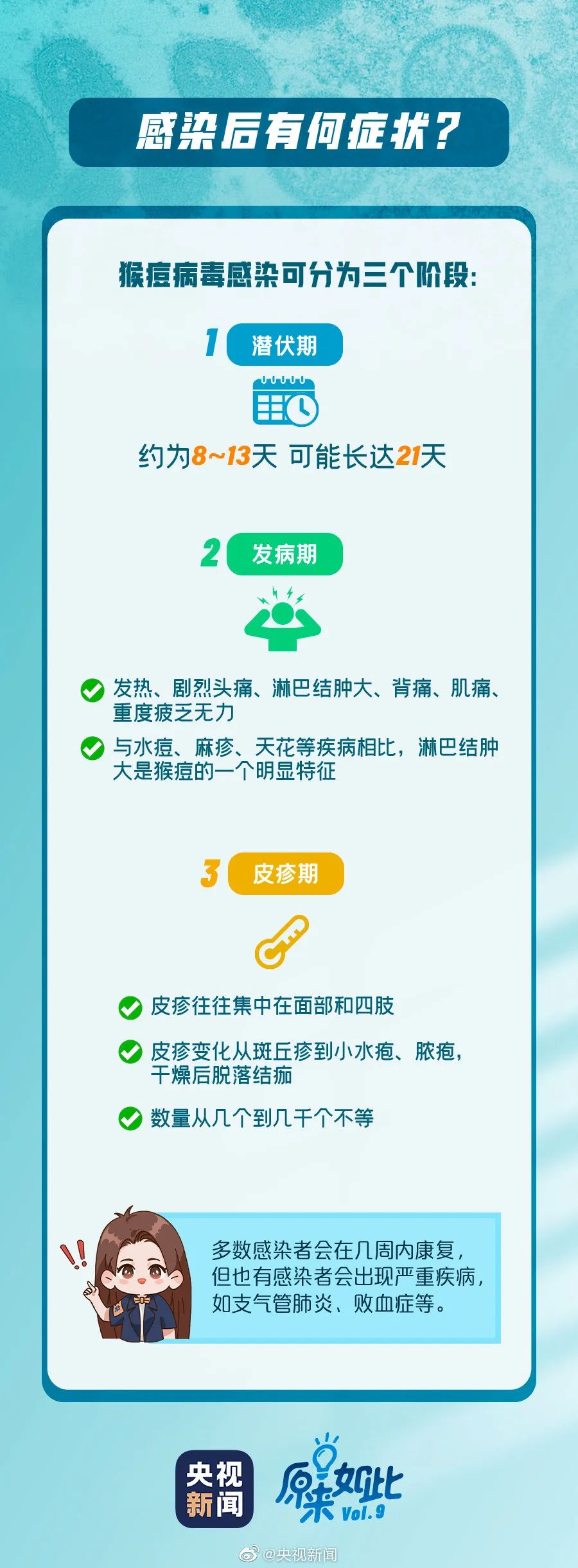 张玲指出,猴痘是一种自限性疾病,其预后大多良好。然而,在儿童和免疫功能低下的人群中,仍会出现严重病例。预后情况与感染的病毒分支、病毒暴露程度、既往健康状况以及并发症的严重程度等相关。目前,猴痘感染的风险相对较低,但我们仍需积极了解预防知识,做好健康防护。每个人都应该成为自己健康的第一责任人。