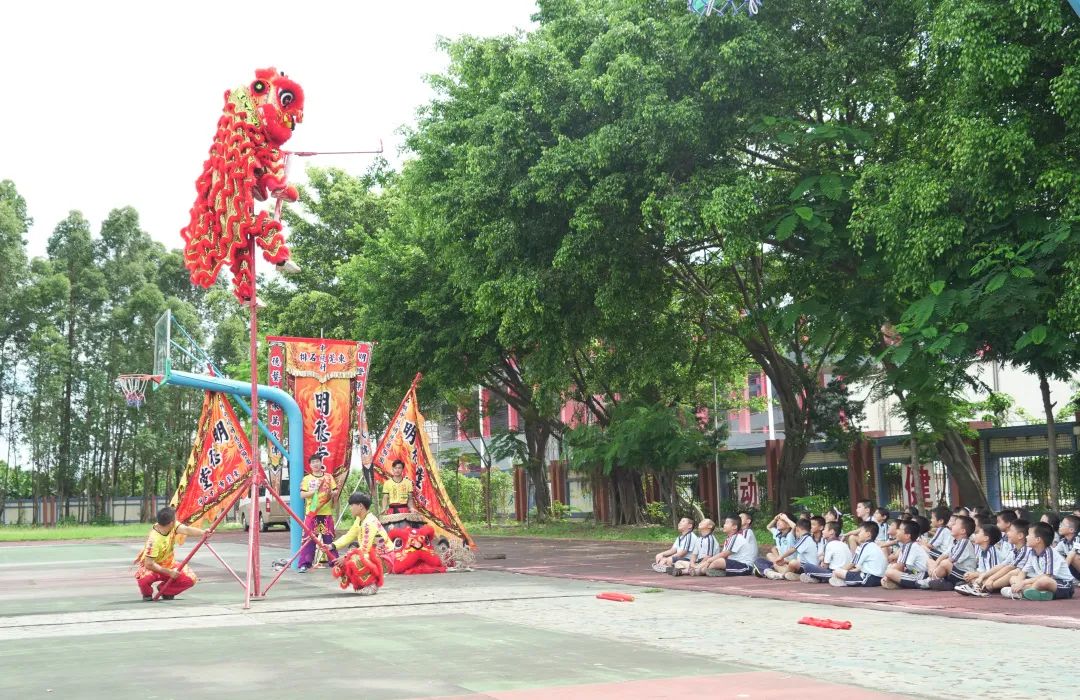 从操场上传来阵阵欢呼声,原来是同学们正在为醒狮技艺鼓掌喝彩。在教学楼大堂里,杨氏太极传承人带着孩子们扎马步,教导孩子们如何气沉丹田。在粤剧脸谱非遗课堂里,传承人向同学们讲解不同粤剧人物的脸谱特征,并教导同学们如何一笔一划地勾勒出自己喜爱的粤剧脸谱。