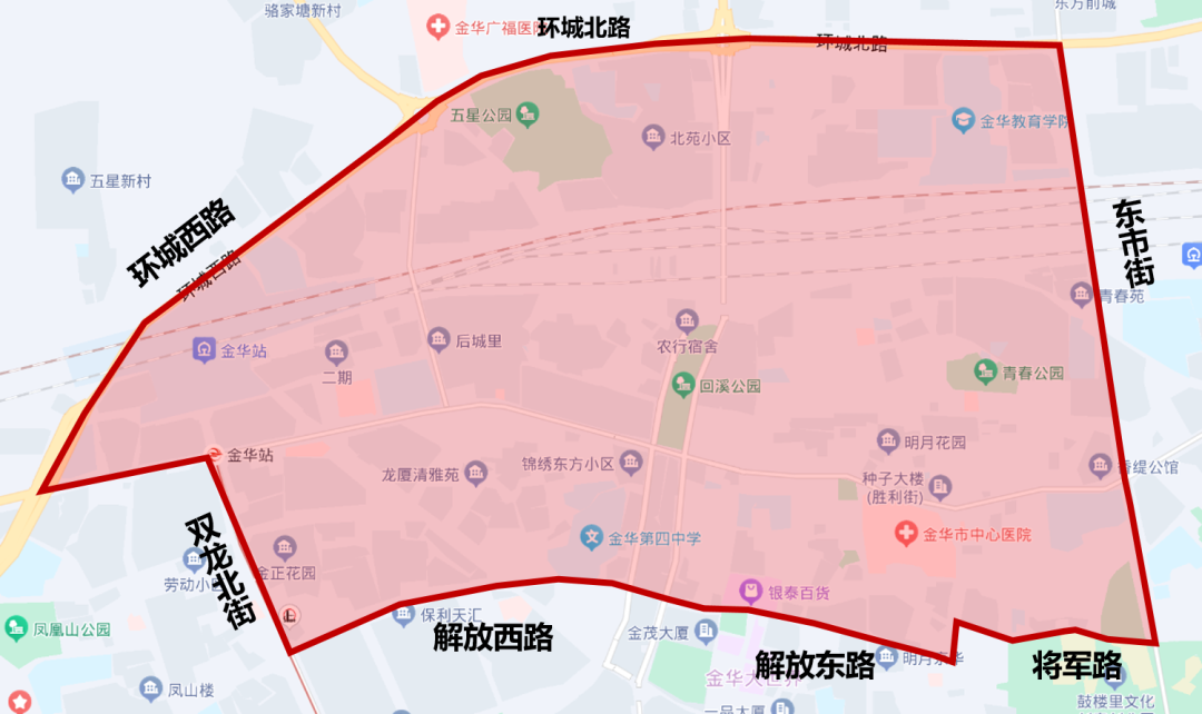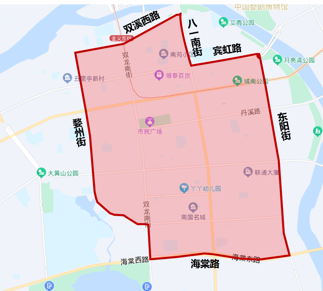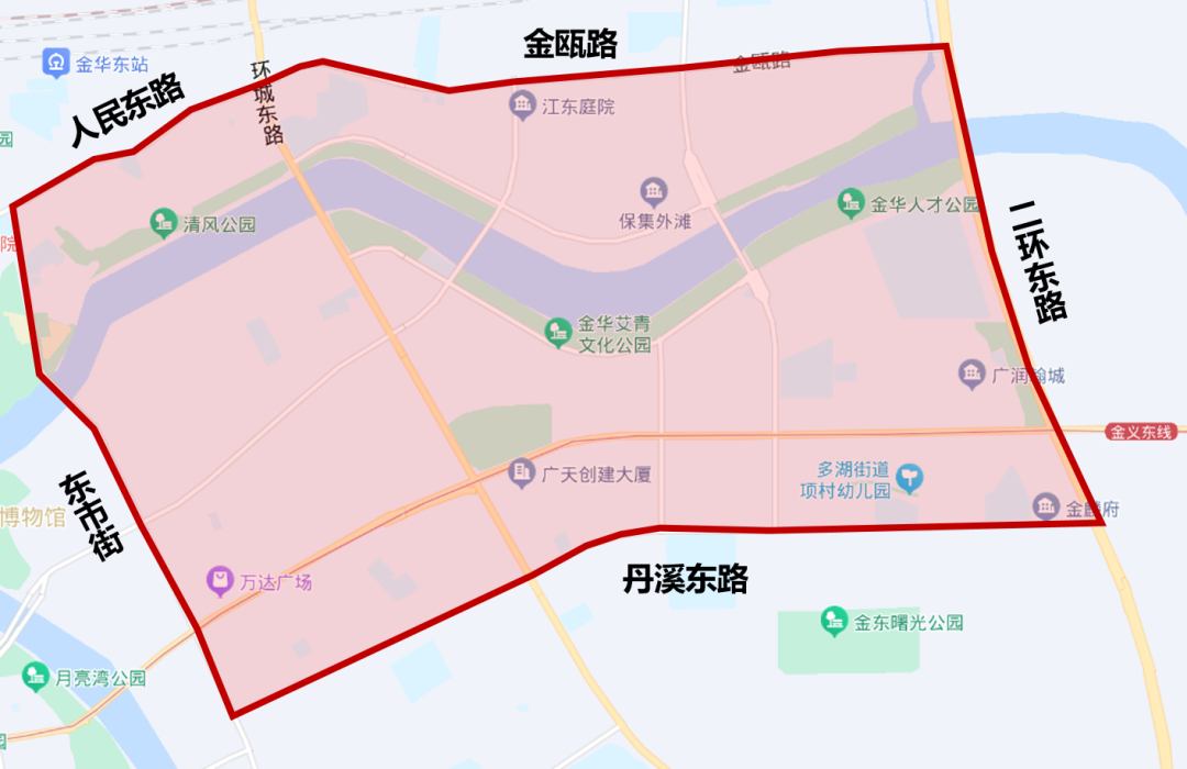 东阳街以东、婺州街以西、双溪西路以北、海棠西路以南的合围区域。