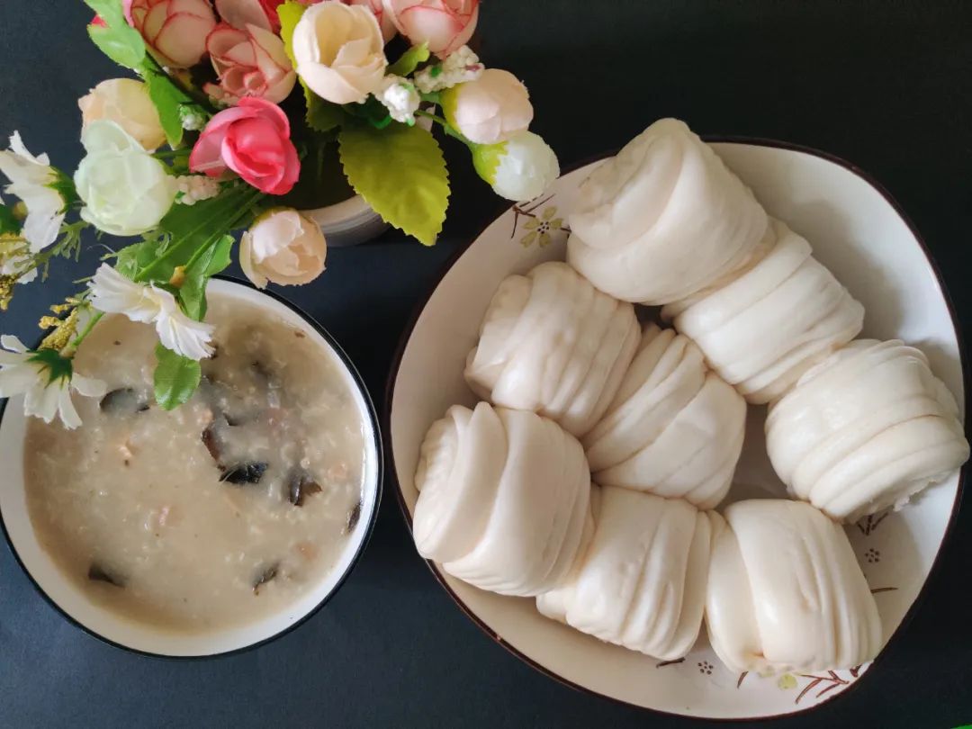 早餐时,品尝着美味的菜干蚝豉瘦肉粥和奶油花卷。