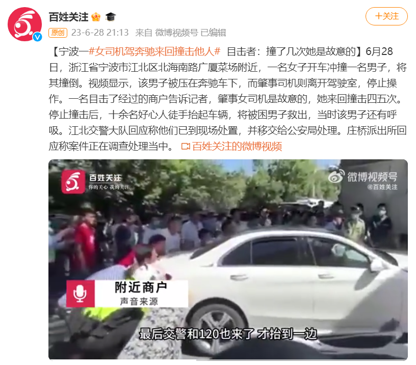6月28日,在浙江宁波市江北区北海南路广厦菜场附近,一名女子驾车冲撞一名男子,将其撞倒在地。视频显示,男子被压在奔驰车下,肇事司机则离开驾驶室,不再操作。目击商户告诉记者,肇事女司机是故意的,她来回撞击了四五次。在停止撞击后,十余名好心人徒手将车辆抬起,将被困男子救出,当时该男子还有呼吸。江北交警大队回应称已到现场处置,并移交给公安局处理。庄桥派出所回应称案件正在调查处理当中。
