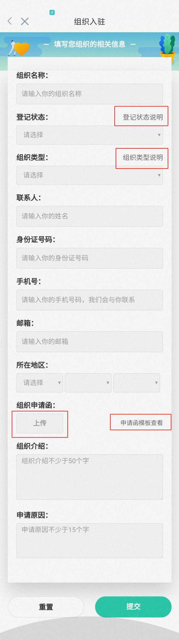 步骤3:填写组织的相应内容,点击【申请函模板查看】,按照申请函模板填写信息后打印盖章,上传盖章后的入驻申请函图片,填写其他信息,全部完成后点击【提交】,等待工作人员审核。审核通过后组织即建立。