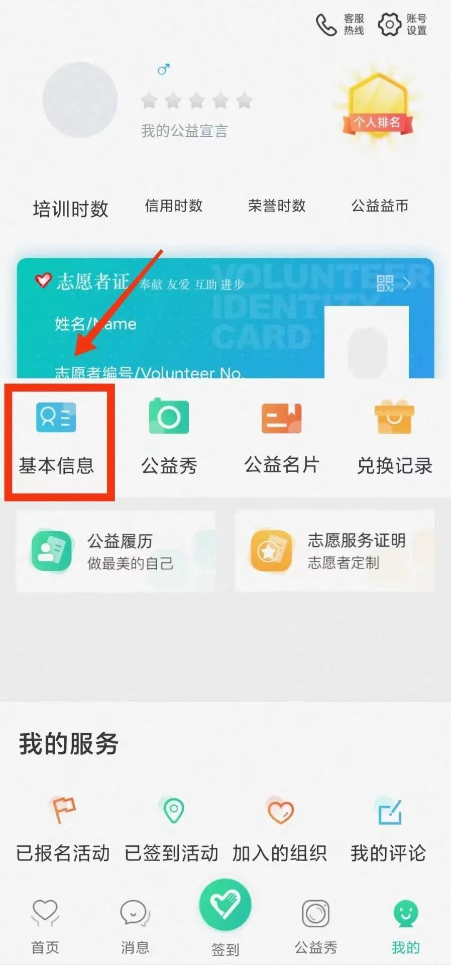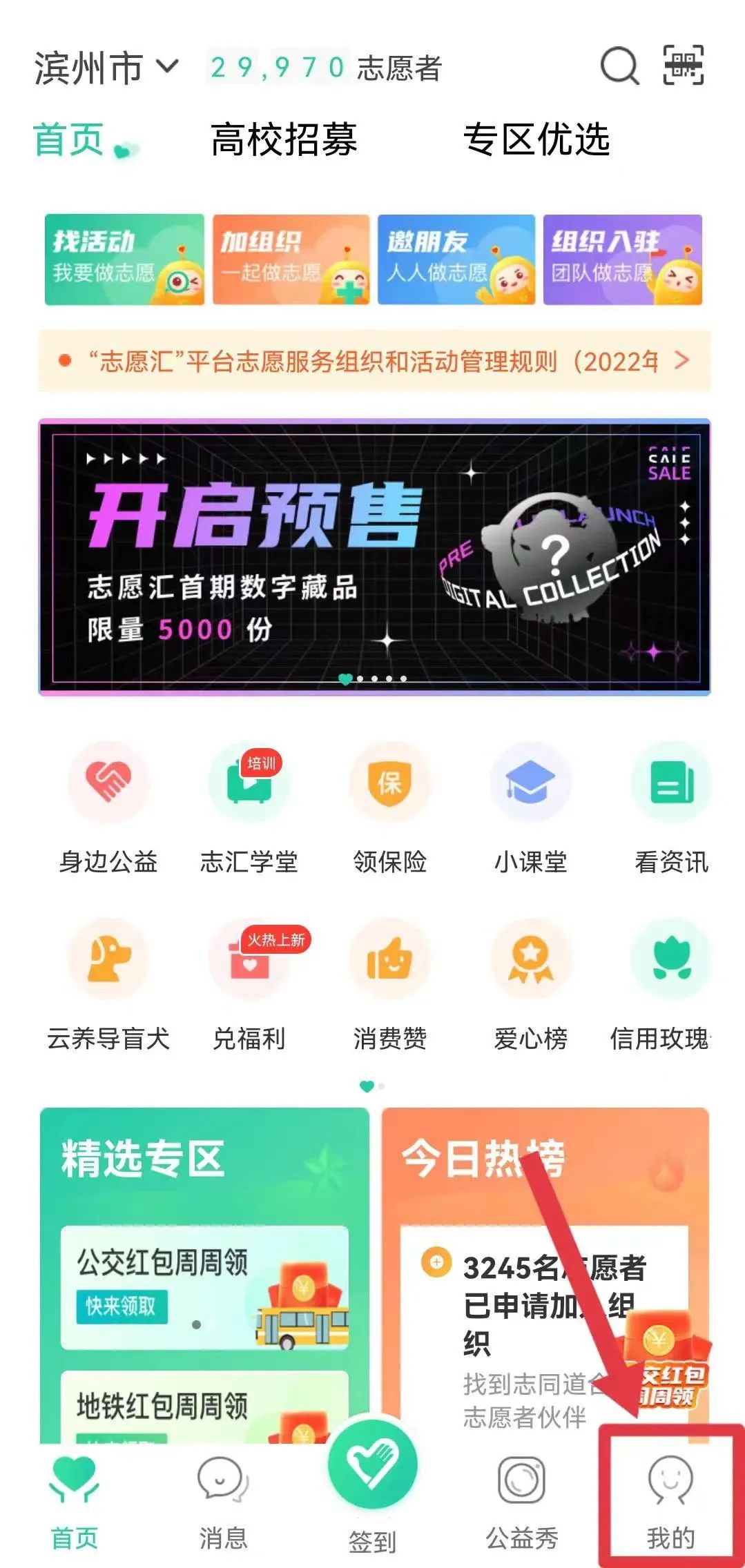 志愿者个人打开“志愿汇”APP,在首页点击右下角“我的”。
