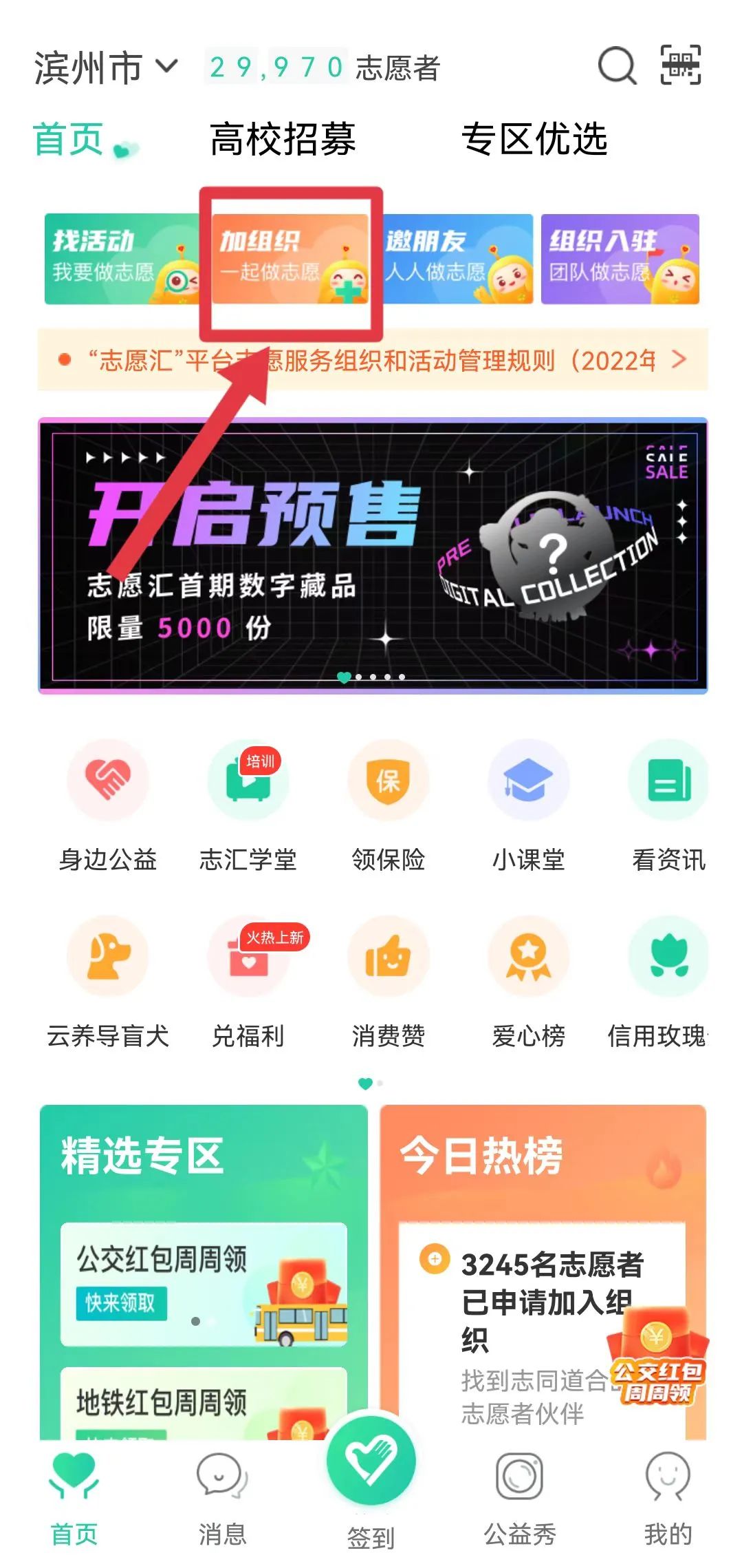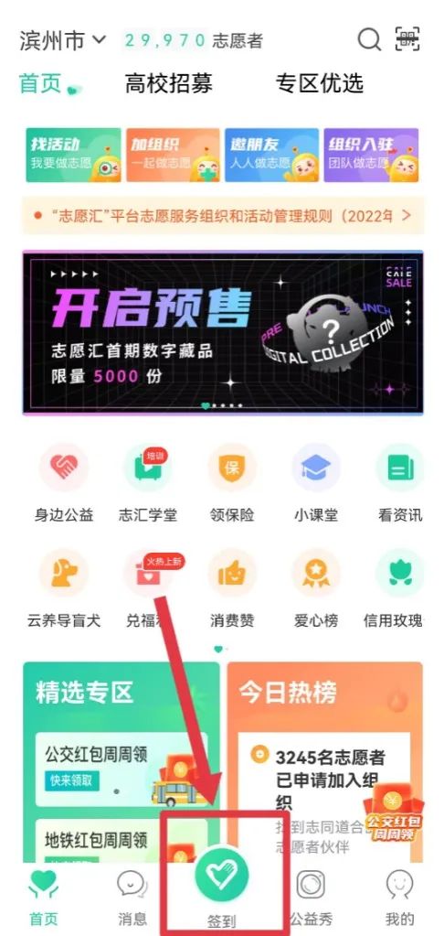 每一个志愿活动都有相应的签到码,报名参加活动的志愿者务必要向活动负责人问清楚签到码。然后在首页点击“签到”按钮。