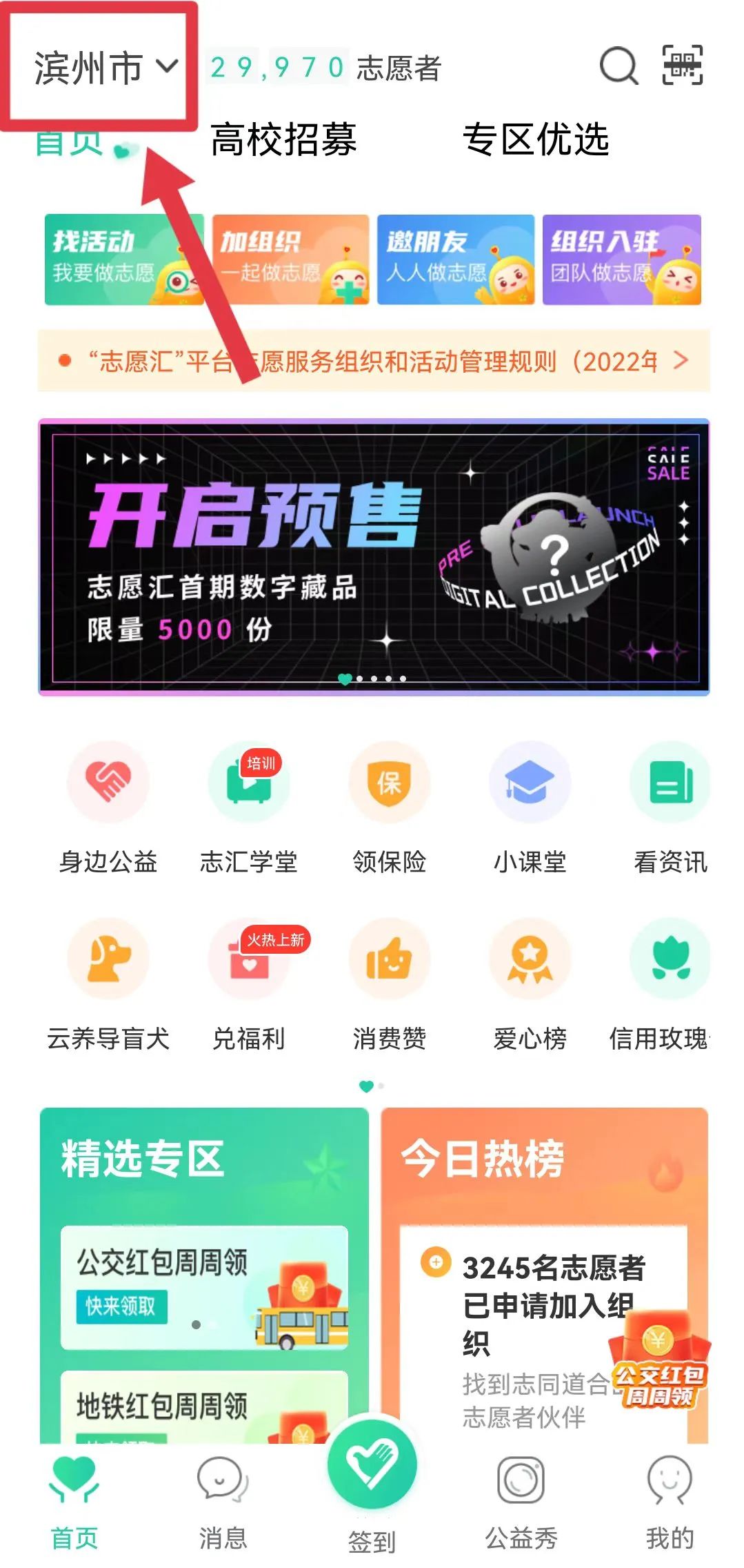 在“首页”点击左上角显示的城市,进入地区选择,选择“滨州市”。