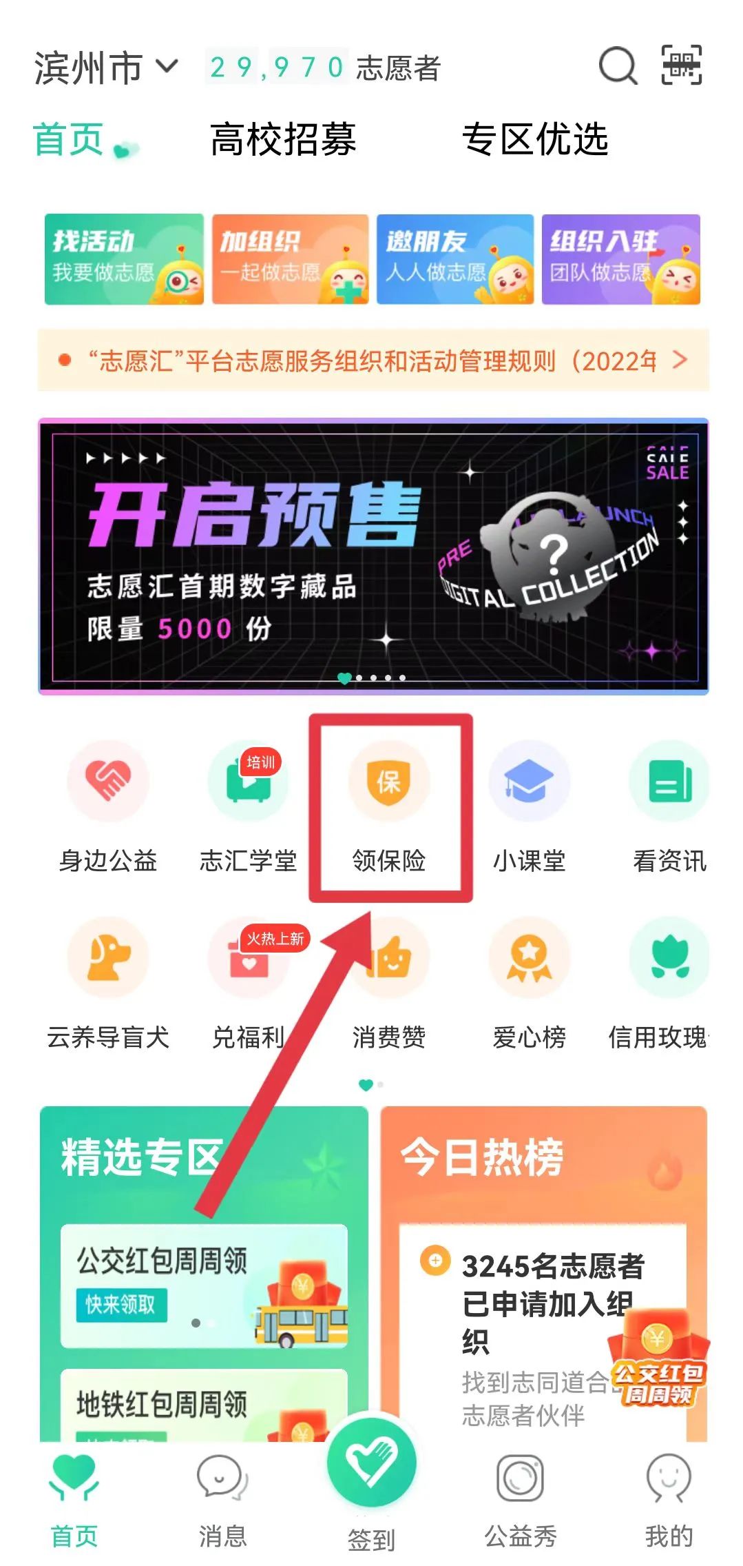志愿者在“首页”点击“领保险”,志愿者保险相关说明及理赔流程在“领保险”专区进行查看。
