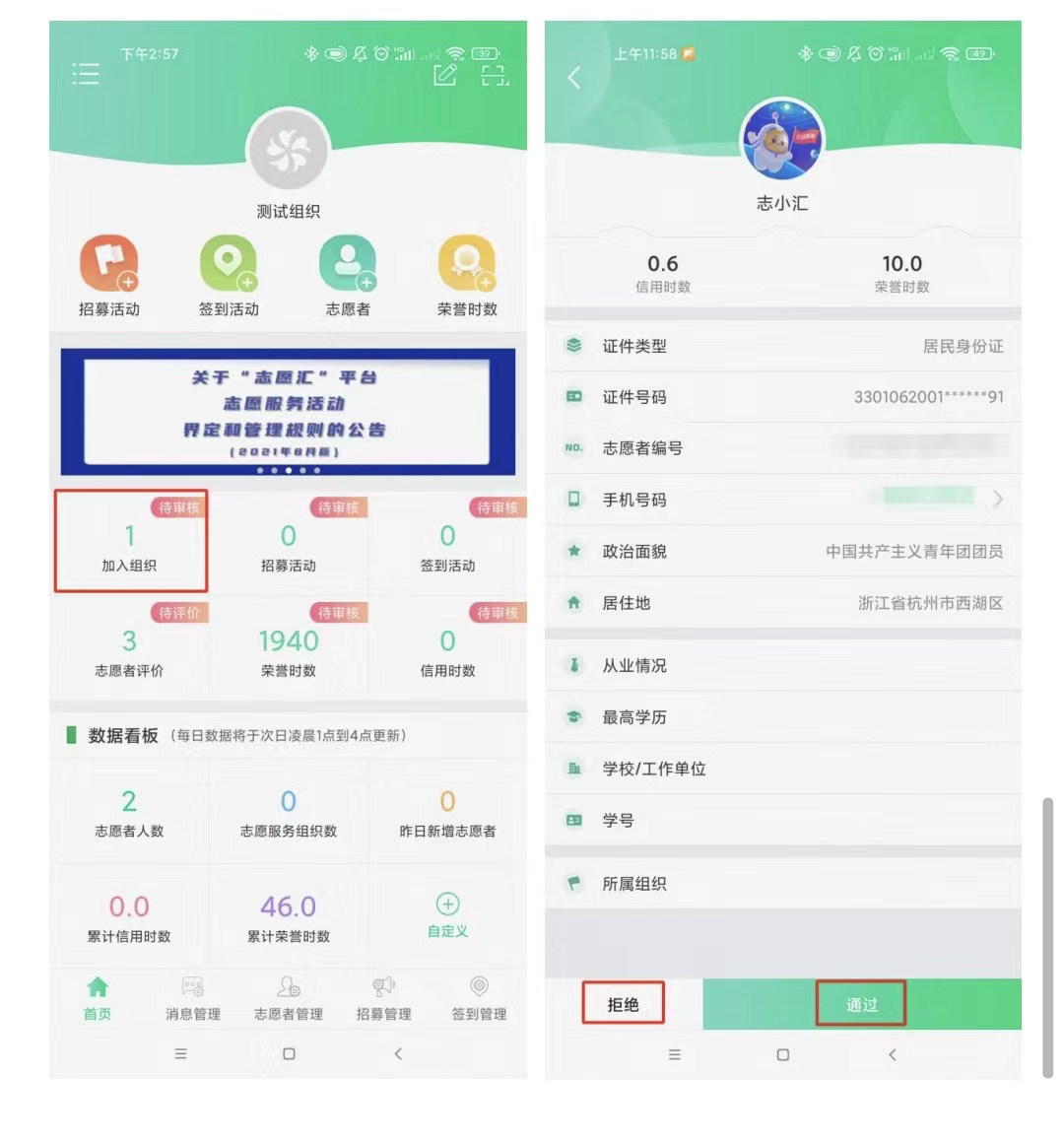 组织入驻审核通过后,组织申请人将收到短信,在应用商店搜索【志愿汇组织版】,下载后根据短信提示使用账号密码登录【志愿汇组织版】。登入成功后,点击【加入组织】,即可查看当前申请加入本组织的志愿者,进行【通过】操作后,志愿者即成功加入组织。