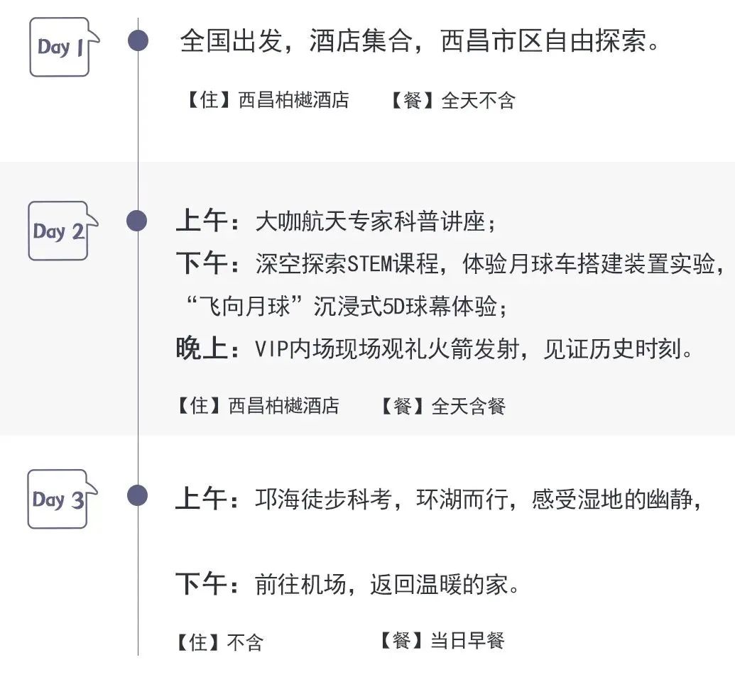 3.第三日上午的行程将包括在邛海徒步进行科考。如果当天政策和军事管控等实际情况允许,我们将免费升级参观发射中心内部。