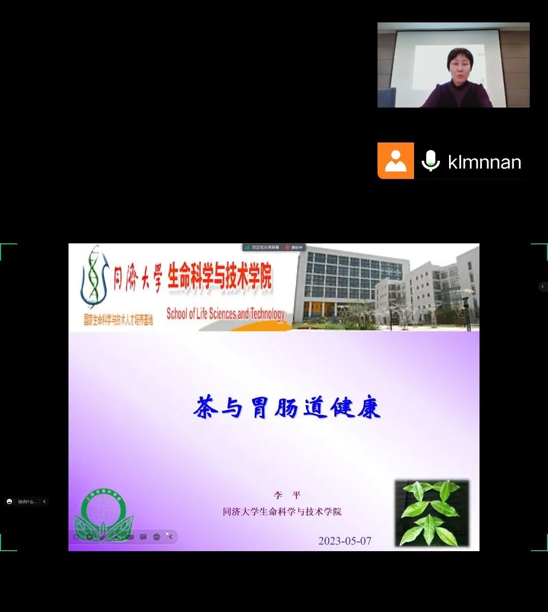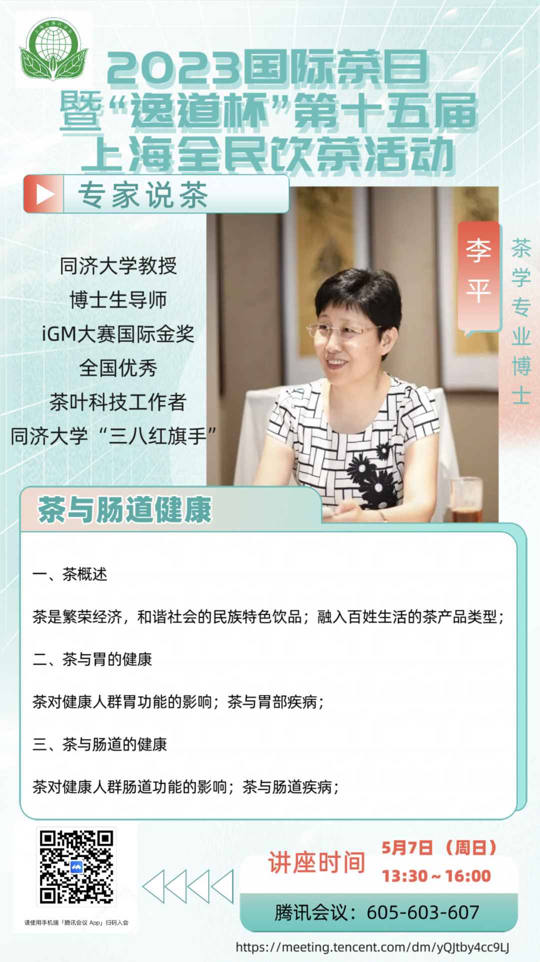 2023年5月7日下午14:00,【2023国际茶日暨“逸道杯”第十五届上海全民饮茶活动之“专家说茶”系列活动(三)】李平——《茶与肠道健康》讲座在腾讯会议上举行。