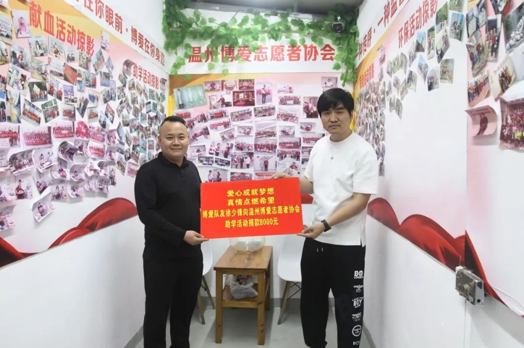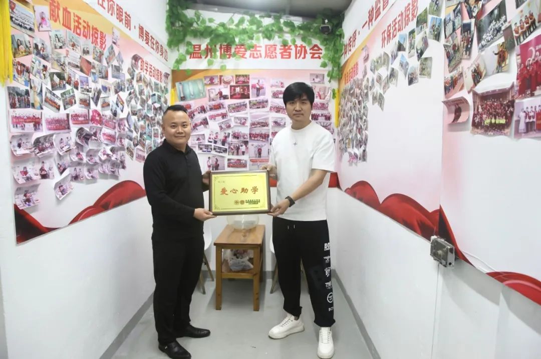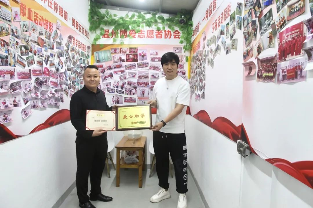 日前,博爱队友徐少锋慷慨解囊,向温州博爱志愿者协会的助学活动捐赠了8000元。为了表达对他的感谢之情,协会于5月3日在办公室举行了颁奖表彰仪式。