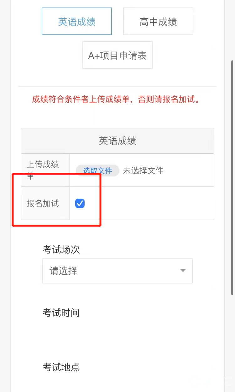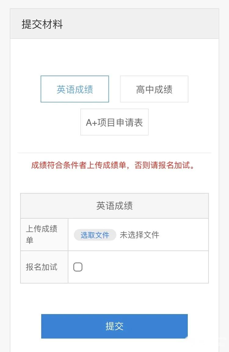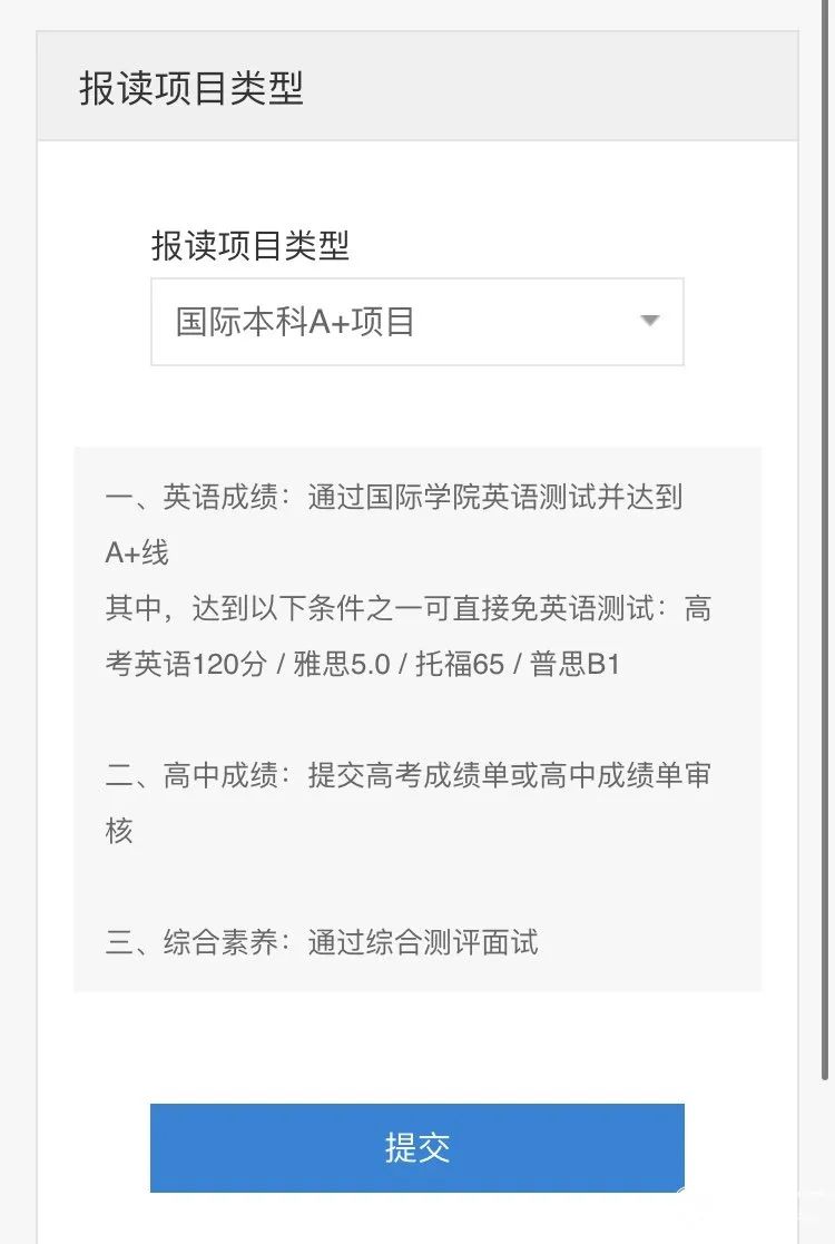 3.填写报读项目后,如果您符合免试条件(高考英语成绩达到120分,雅思成绩达到5.0分,托福成绩达到65分,普思考试成绩达到B1级),您可以直接上传您的成绩单和其他相关材料。