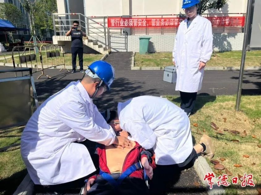演练现场模拟了一种情况,即高效沉淀池的排空阀门井出现故障,导致排空阀无法正常工作。维修人员需要下井进行维修,但在井底时吸入了有毒气体,导致部分人员出现头晕现象并倒地。在危急时刻,班组长迅速冷静下来,并立即启动应急预案。他先向上级汇报情况,然后发出求救信息,并拨打120急救电话。收到救援信息后,工作人员立即对事故区域进行警戒,并由应急救援组进行井下通风和有害气体检测。在确认安全后,工作人员将作业人员提升出井外,并用担架抬放至安全地点。医疗救护组迅速对受伤人员进行现场急救,并等待救护车到达现场后将受伤人员送往“医院”进行进一步检测和治疗。演练过程中,应急救援队伍有条不紊地按照预警、响应、救援、救护等阶段高效进行,及时保障了人员安全。