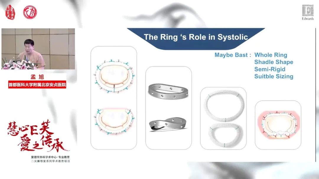 孟旭教授指出,二尖瓣修复的最终目标是恢复瓣膜的持续正常功能,并保留或提高左室功能。为了达到这些目标,临床术者应以鞍形状态(瓣叶膨隆,瓣体及腱索张力)、A-P距离(对合缘高度维持)和瓣环重塑(扩大瓣环和/或矫正畸形瓣环)为治疗目的和标准,选择合适的人工成形环。 当前二尖瓣成形环种类繁多,其中半环相较于全环更有利于瓣膜舒张期运动和瓣口开放,但需具备良好锚定点(纤维三角)且不利于鞍形状态维持;全环可创造更确切的对合缘高度,并更易于术者在交界处实行环缩术。此外,还需基于瓣叶面积选择尺寸合适的成形环。 需要重点纠正的是,瓣叶膨隆和曲度才是马鞍形二尖瓣环的重要基础。选择小尺寸成形环并不能为退行性二尖瓣反流(DMR)患者带来额外获益。 基于上述内容,可总结得出三大基本成形环类型选择原则:良好舒张期压差的二尖瓣开放、收缩期合理的对合缘高度、充分的(no-SAM)前叶膨隆空间。 最后,孟旭教授总结道,环的作用仍主要体现在收缩期,因此“全环、马鞍、弹性以及合适的型号大小”仍然是选择成形环的最佳考量。