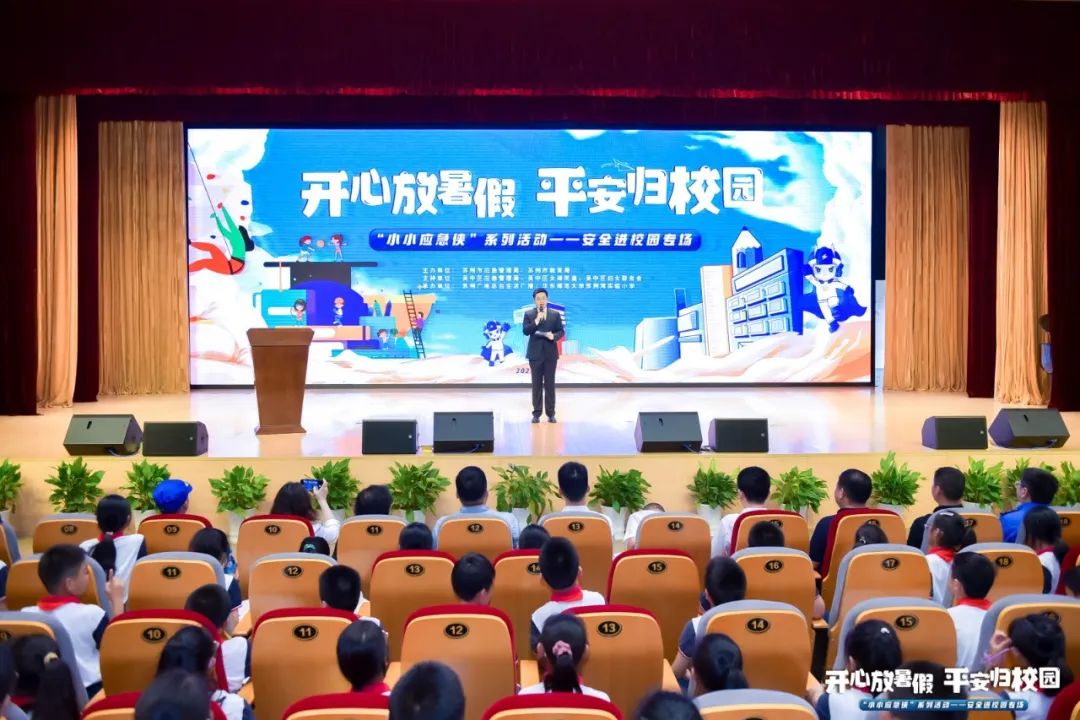 6月25日下午,华东师范大学附属苏州湾实验小学(报告厅)举办了一场名为“小小应急侠”的安全进校园专场活动。该活动由苏州市应急管理局、苏州市教育局主办,吴中区应急管理局、吴中区太湖街道、吴中区妇女联合会支持。苏州广电传媒集团(总台)生活广播和华东师范大学苏州湾小学承办。