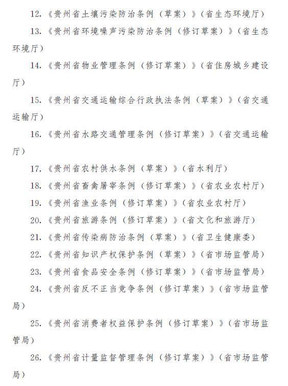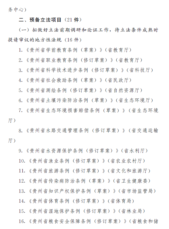 (二)围绕建设“四区一高地”,积极探索西部大开发新格局。我们将提请省人大常委会审议贵州省农村供水条例草案、贵州省数字政府建设条例草案、贵州省土壤污染防治条例草案、贵州省陆生野生动物保护条例草案、贵州省科学技术进步条例修订草案、贵州省促进科技成果转化条例修订草案、贵州省科学技术资金投入管理条例修订草案、贵州省环境噪声污染防治条例修订草案、贵州省湿地保护条例修订草案。此外,我们还将修订贵州省科学技术奖励办法、贵州省征收征用林地补偿费用管理办法、贵州省电信通信线路设施保护办法。 预备提请省人大常委会审议的法规包括贵州省生态环境损害赔偿条例草案、贵州省污染源自动监控条例草案、梵净山国家公园条例草案、贵州省地下水管理条例草案、贵州省园林绿化条例草案、贵州省畜牧条例草案、贵州省野生植物保护条例草案、贵州省科学技术普及条例修订草案、贵州省农产品质量安全条例修订草案、贵州省水资源保护条例修订草案、贵州省红枫湖百花湖水资源环境保护条例修订草案、贵州省城市市容和环境卫生管理条例修订草案、贵州省农业机械管理条例修订草案、贵州省农村集体资产管理条例修订草案、贵州省政府数据共享开放条例修订草案、贵州省促进民族团结进步条例修订草案。 预备制定的法规有贵州省水土保持补偿费征收管理办法。预备修订的法规有贵州省农村公路建设养护管理办法。
