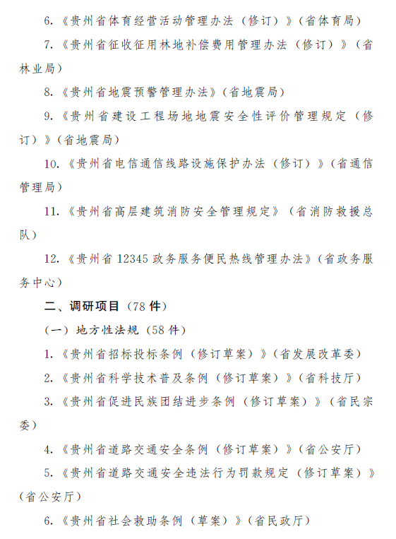 (三)围绕统筹发展和安全,推进平安贵州建设。我们将提请省人大常委会审议贵州省基本农田保护条例修订草案、贵州省粮食安全保障条例修订草案、贵州省反间谍安全防范条例草案、贵州省防震减灾条例修订草案、贵州省消防条例修订草案和贵州省气象条例修订草案。同时,我们将制定贵州省地震预警管理办法和贵州省高层建筑消防安全管理规定。此外,我们还将修订贵州省乡镇自用船舶安全管理办法和贵州省建设工程场地地震安全性评价管理规定。预备提请省人大常委会审议的法规有贵州省城镇房屋安全管理条例草案、贵州省地质灾害防治条例草案、贵州省道路交通安全条例修订草案、贵州省道路交通安全违法行为罚款规定修订草案和贵州省人民防空条例修订草案。预备制定的法规有贵州省安全生产预防管理规定、贵州省气象灾害防御重点单位气象安全管理办法和贵州省气象数据安全管理办法。预备修订的法规有贵州省施放气球管理办法。