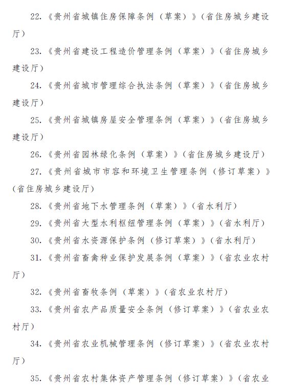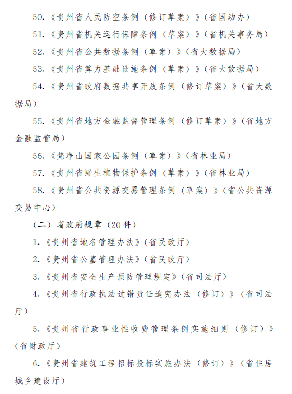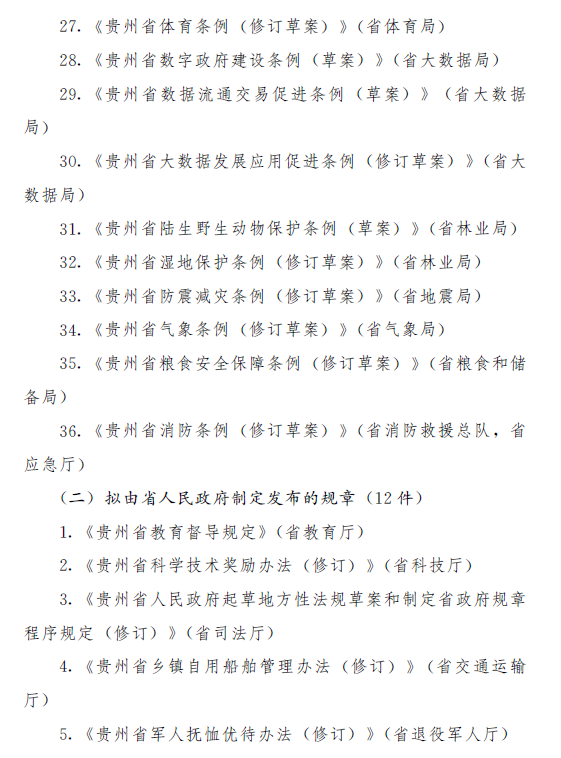 (一)围绕“四新”主攻“四化”,推进贵州产业发展。提请省人大常委会审议贵州省矿产资源管理条例修订草案、贵州省数据流通交易促进条例草案、贵州省畜禽屠宰条例修订草案、贵州省大数据发展应用促进条例修订草案、贵州省旅游条例修订草案、贵州省渔业条例修订草案、贵州省体育条例修订草案、贵州省反不正当竞争条例修订草案、贵州省水路交通管理条例修订草案、贵州省测绘条例修订草案、贵州省计量监督管理条例修订草案、贵州省知识产权保护条例草案。预备提请省人大常委会审议贵州省能源条例草案、贵州省城镇住房保障条例草案、贵州省住房租赁条例草案、贵州省大型水利枢纽管理条例草案、贵州省畜禽种业保护发展条例草案、贵州省托育服务条例草案、贵州省公共数据条例草案、贵州省算力基础设施条例草案、贵州省公共资源交易管理条例草案、贵州省建设工程造价管理条例草案、贵州省招标投标条例修订草案、贵州省非物质文化遗产保护条例修订草案、贵州省统计管理条例修订草案、贵州省地方金融监督管理条例修订草案。预备制定贵州省水利风景区管理办法、贵州省成品油流通管理办法。预备修订贵州省建筑工程招标投标实施办法、贵州省通航设施管理办法、贵州省港口管理办法、贵州省拍卖管理办法、贵州省体育经营活动管理办法、贵州省行政事业性收费管理条例实施细则、贵州省车船税实施办法、贵州省人民政府关于征收土地增值税的若干规定。