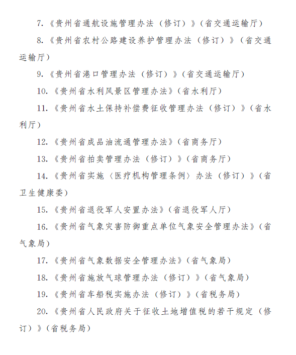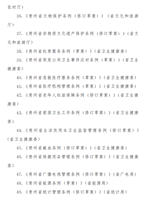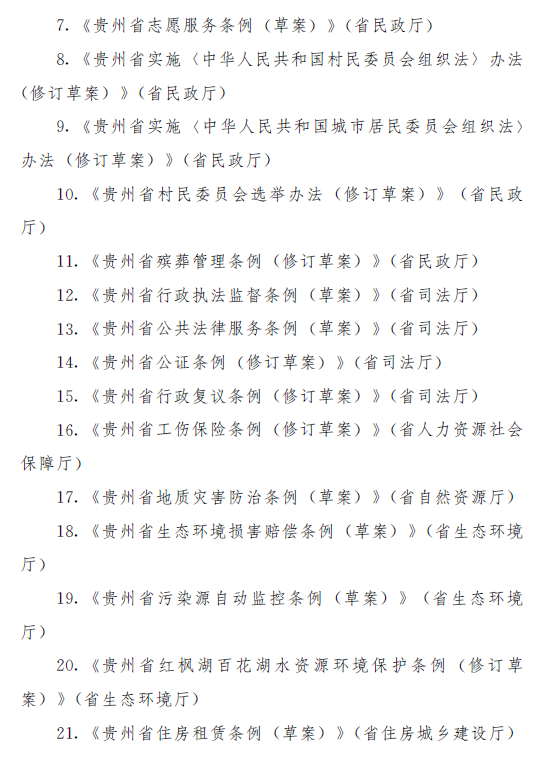 (五)围绕提升公共服务水平,保障和改善民生。我们将提请省人大常委会审议贵州省学前教育条例草案、贵州省慈善条例草案、贵州省传染病防治条例草案、贵州省职业教育条例修订草案、贵州省物业管理条例修订草案、贵州省食品安全条例修订草案、贵州省消费者权益保护条例修订草案。此外,我们还将制定贵州省教育督导规定和贵州省12345政务服务便民热线管理办法。同时,我们将修订贵州省军人抚恤优待办法。 预备提请省人大常委会审议的还有贵州省社会救助条例草案、贵州省突发公共卫生事件应对条例草案、贵州省急救医疗服务条例草案、贵州省志愿服务条例草案、贵州省医疗机构管理条例草案、贵州省殡葬管理条例修订草案、贵州省工伤保险条例修订草案、贵州省文物保护条例修订草案、贵州省老年人权益保障条例修订草案、贵州省生活饮用水卫生监督管理条例修订草案、贵州省爱国卫生工作条例修订草案、贵州省献血条例修订草案、贵州省保健用品管理条例修订草案、贵州省广播电视管理条例修订草案。 预备制定的还有贵州省公墓管理办法和贵州省退役军人安置办法。预备修订的还有贵州省实施《医疗机构管理条例》办法。