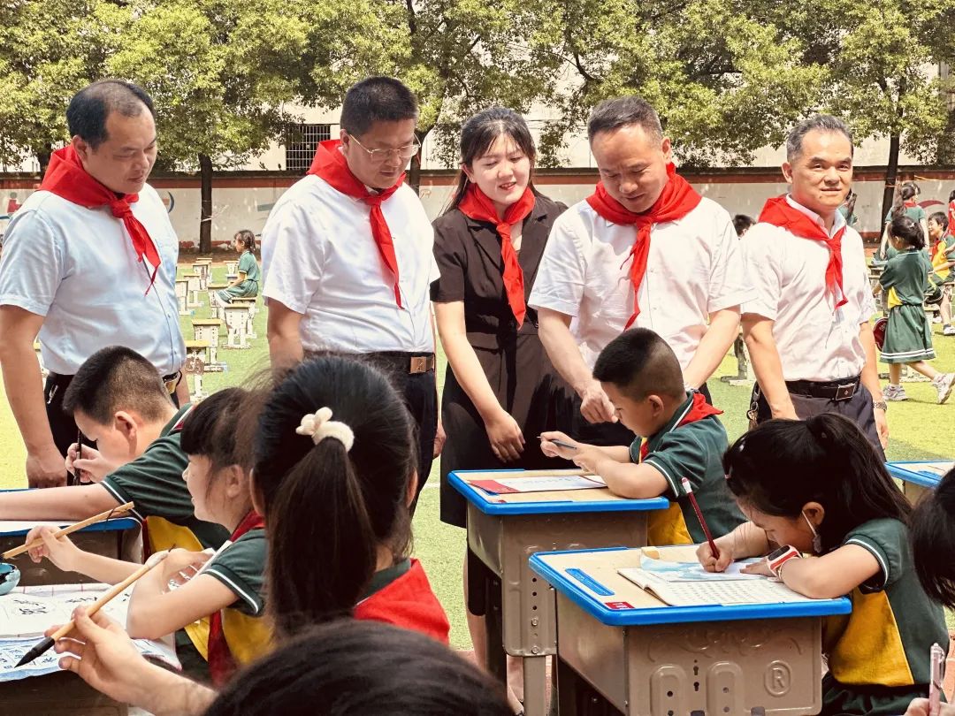 当李彦文来到娄底四小时,他受到了少先队员的欢迎。在他们的带领下,他参观了师生主题书画展、纸伞艺术绘画展、机器人表演和绳操表演。他还观摩了少先队入队仪式,与大家一起参与了活动。