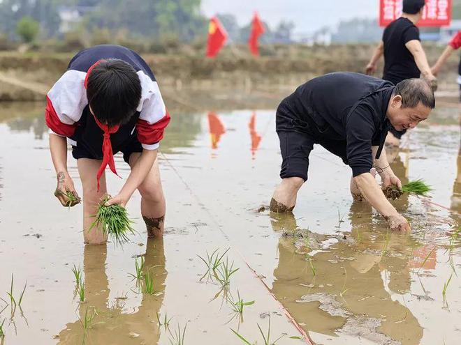 「看!那些有种植经验的孩子们,他们迫不及待地将秧苗放入挖好的小洞中。」