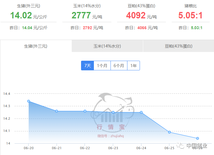 注:本文中提到的“红色字体表示涨或平、绿色字体表示跌”数据来源于行情宝。生猪的价格为“元/kg”,而玉米和豆粕的价格则以“元/t”为单位。此价格为生猪的成交价格,仅供参考。