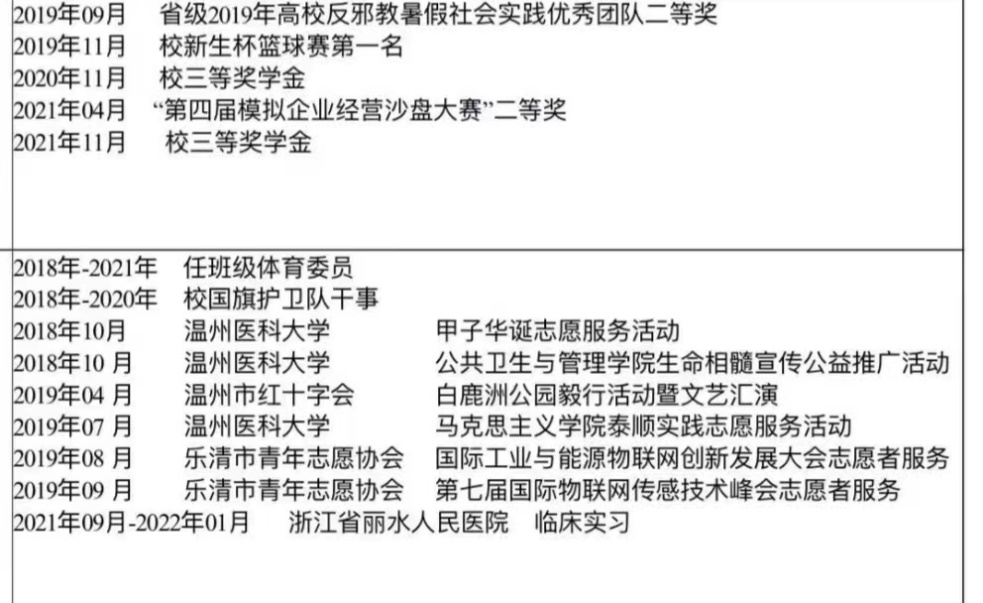 曾获得浙江省政府奖学金、校一等奖学金、校二等奖学金、校三好学生和校优秀毕业生等荣誉。曾担任班级团支书和权益委员。