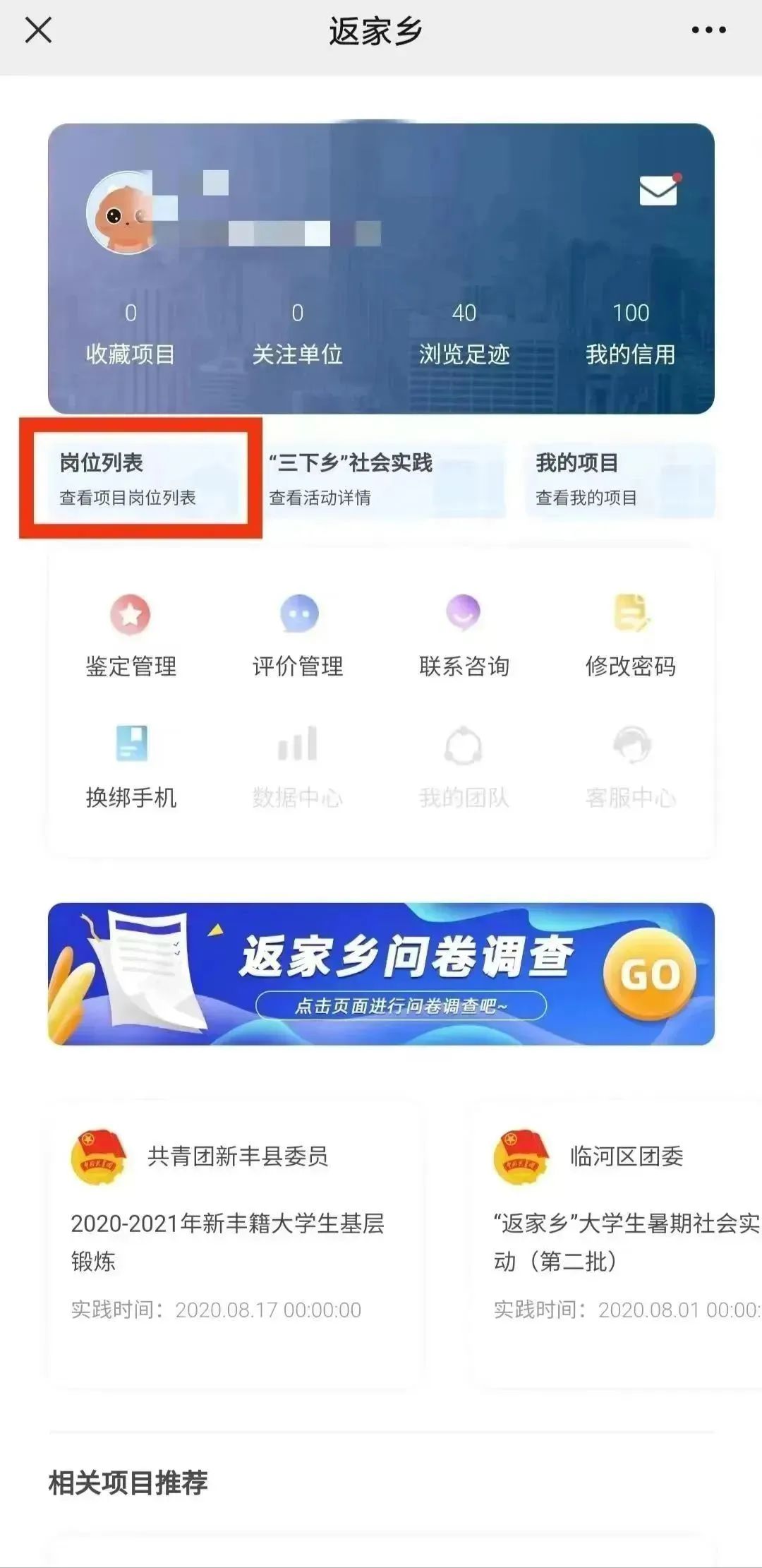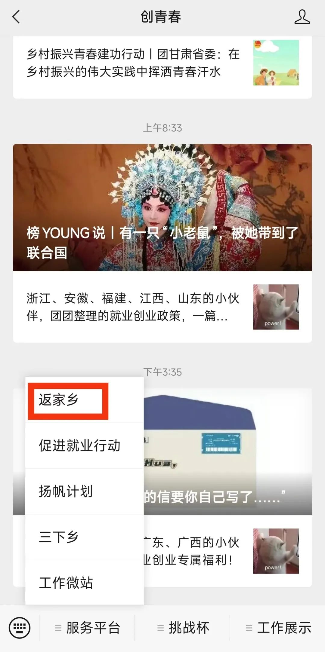 大家可以使用手指轻点并关注“创青春”公众号,然后选择“服务平台”中的“返家乡”栏目,这样就可以成功进入并实现岗位报名。