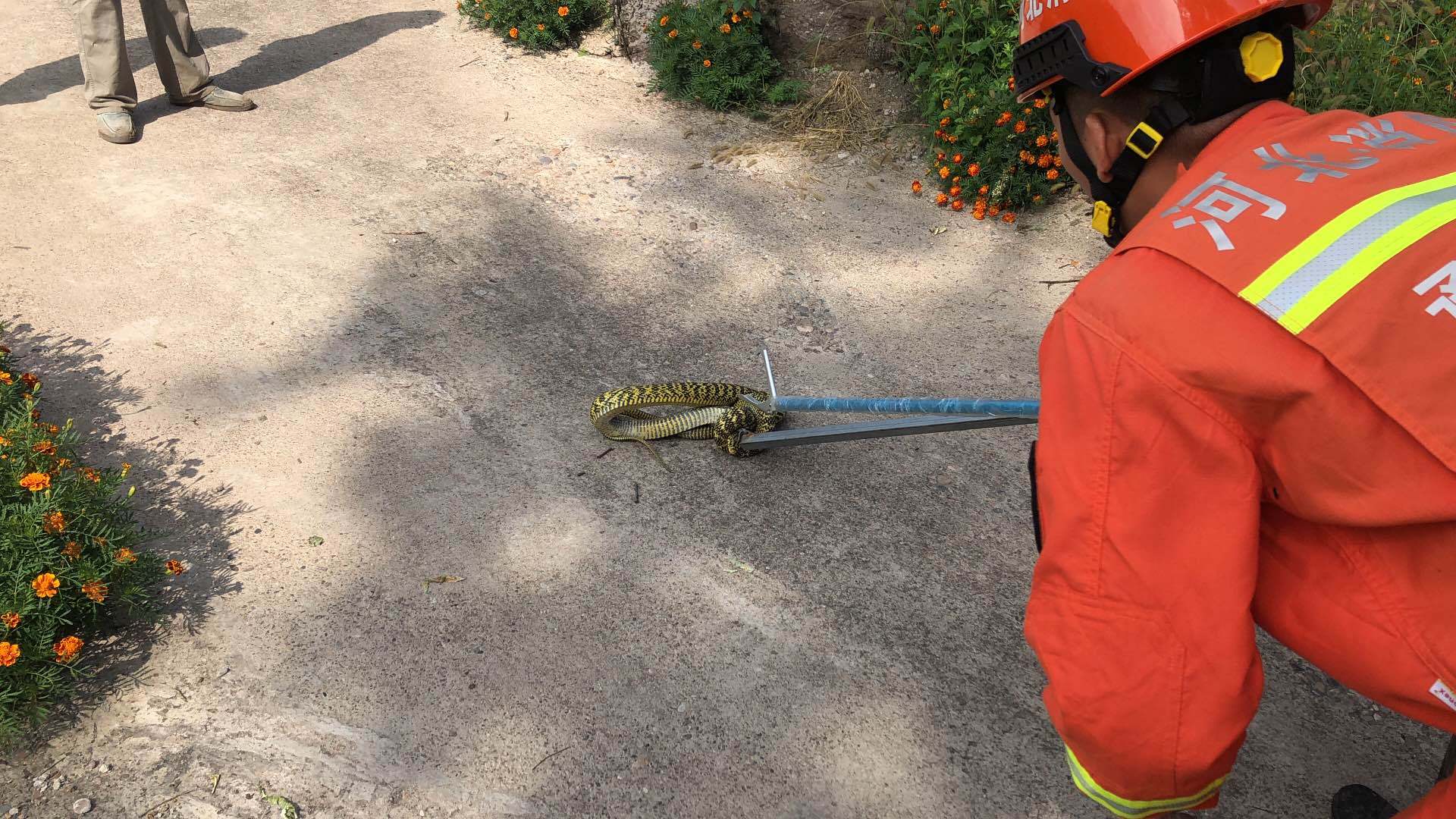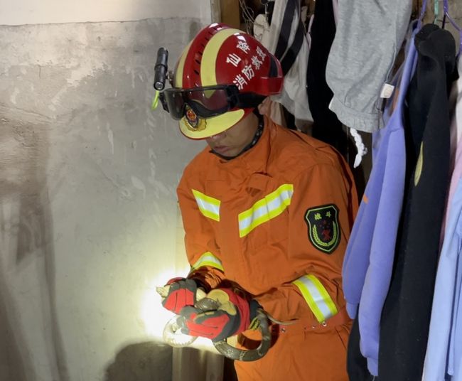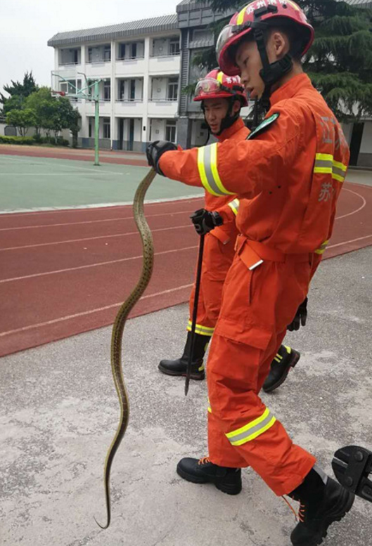 消防员迅速使用捕蛇器将它捕获。