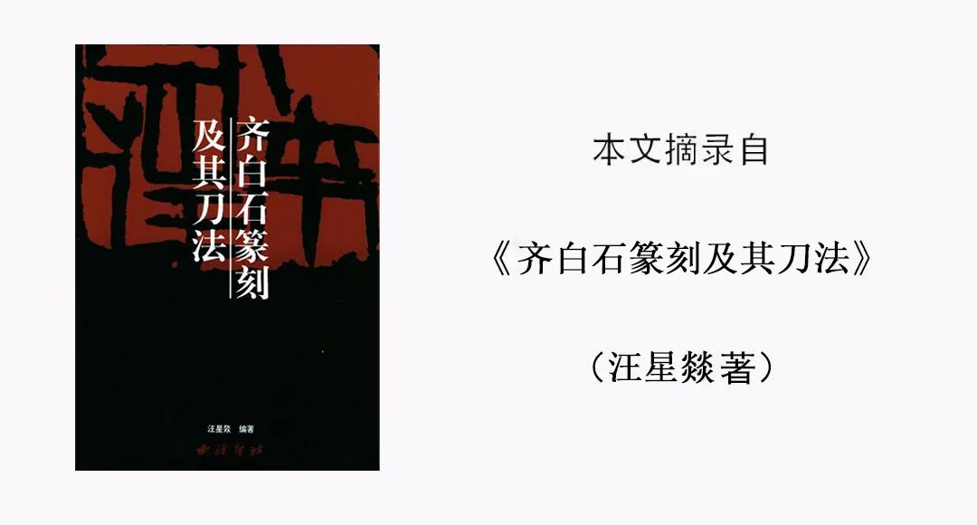 齐白石的刀法深受赵之谦“丁文蔚”印章中冲刀直入的启发,并借鉴了《天发神谶碑》和《三公山碑》等文字的笔法。他以“木人”独特的气魄和胆略,用刀如槌凿,猛利强悍、激越痛快、气势宏伟而创新貌。虽然他也有不少作品锋芒过露、欠含蓄、用刀单一、少变化,但其中少数精品极富视觉冲击力,震撼人心,猛利中有蕴藉,痛快中寓沉雄。