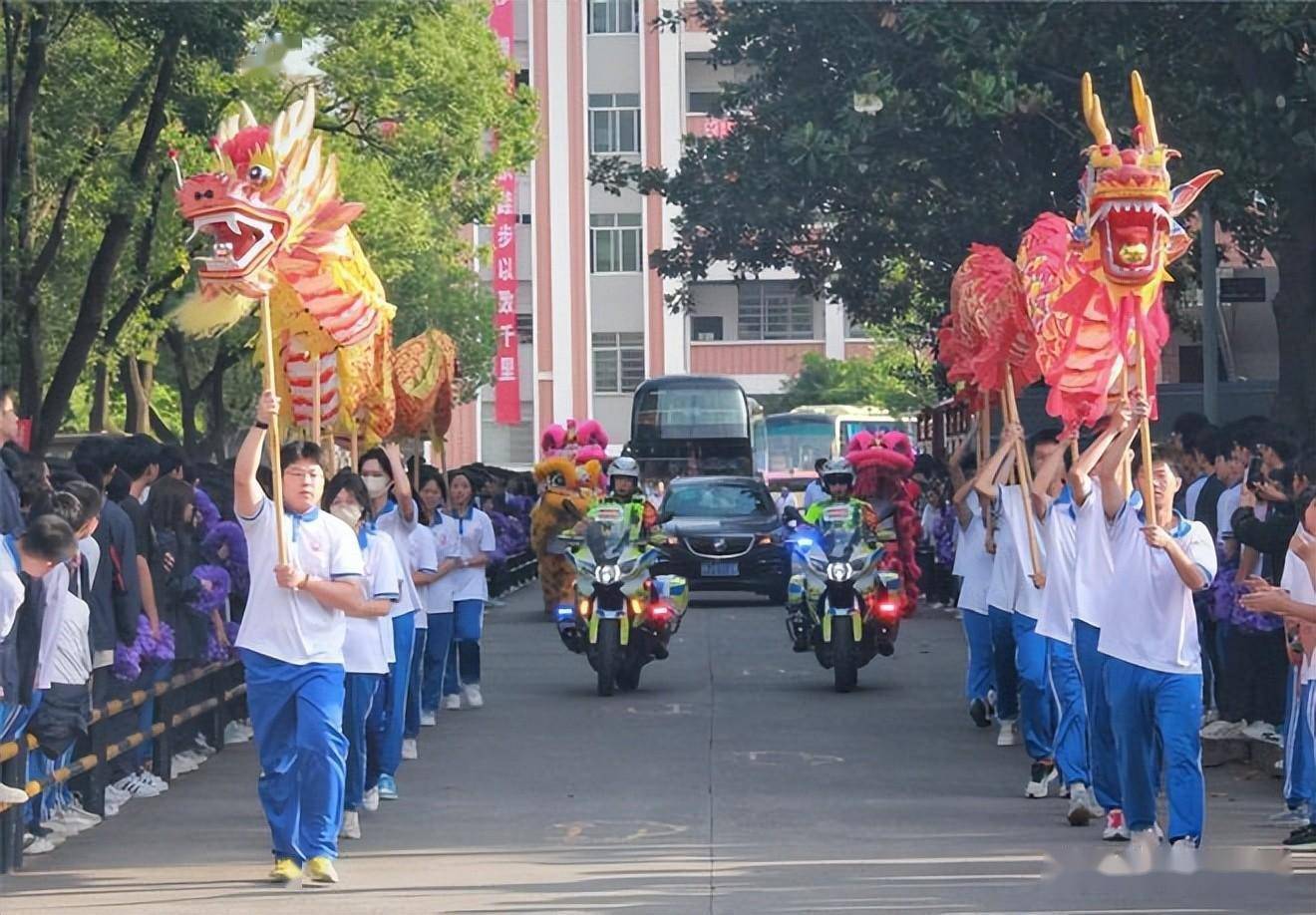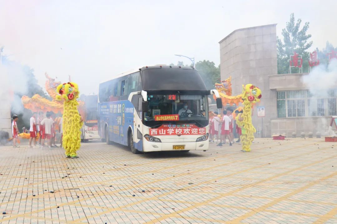 13辆载着西山高三学子的高考送生车准时出发。前方有龙狮引导,后方有锣鼓助威,烟花礼炮齐鸣,场面十分热闹。人们群情激昂,用铿锵有力的祝福声和助威声表达对考生的祝福和支持。在充满喜庆的龙狮、锣鼓、烟花、礼炮和祝福声中,送考车缓缓驶向高考考点。西山学子们的高考之旅即将扬帆起航!