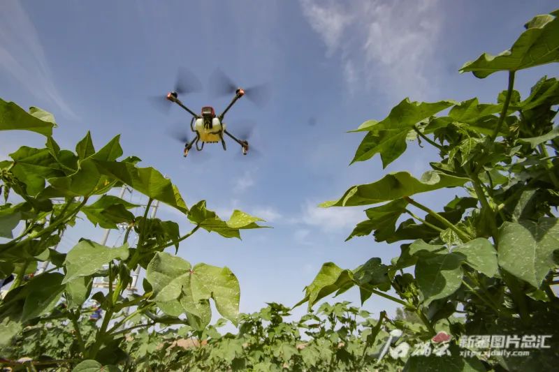 6月22日,在尉犁县阿西木和田片区智慧农场,一台植保无人机正在进行飞防作业。摄影师:石榴云/新疆日报记者蔡增乐。