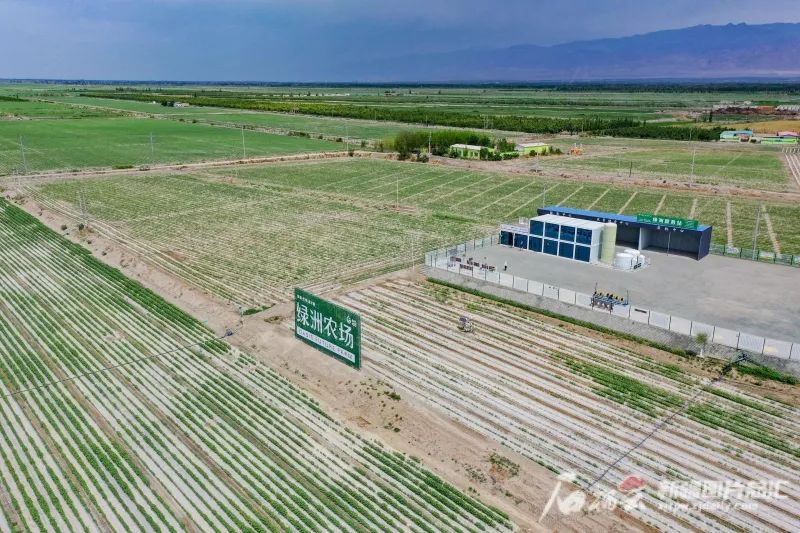 6月22日,无人机拍摄了新疆绿洲驼铃农业发展有限公司“绿洲农场”的一角。石榴云/新疆日报记者蔡增乐摄。