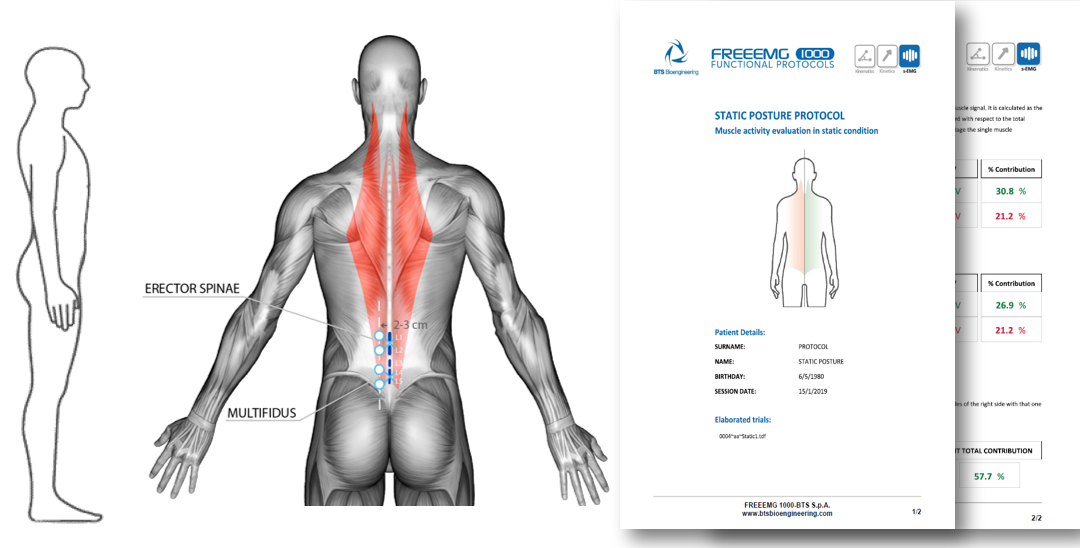 当人体保持静止时,肌肉会等长收缩。静态姿势评估模板能够评估躯干左右两侧相关肌肉是否对称激活。如果两侧肌肉不对称激活,可能会导致脊柱畸形等问题。