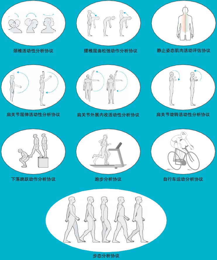 功能性测试协议可用于快速完成步态分析、姿势分析、腰部动作、颈部动作分析、肩部动作分析、自行车动作分析、跑步分析和跳跃分析。它是制定最佳康复训练方案和治疗前后效果分析的重要工具。