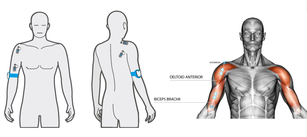 想要完成肩关节的功能评估,只需将无线表面肌电设备放置在需要测试的肌肉上,并配合G-sensor2同步测试即可。