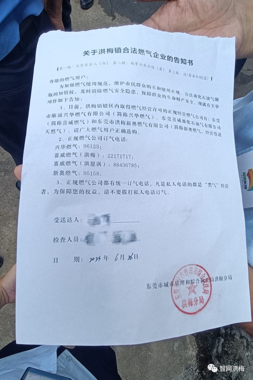 6月26日,网格管理员在梅沙村巡查时,发现一简易汽修站的员工宿舍违规存储和使用“黑气”。网格管理员立即上报,并迅速联合洪梅城管分局到场处置。经核查,该宿舍楼内有1台燃气直排式热水器和7个液化石油气瓶(规格为30公斤级),其中气瓶均为来路不明的“黑气瓶”。执法人员当场向业主发放了《关于洪梅镇合法燃气企业的告知书》,并将在进一步处理此事。