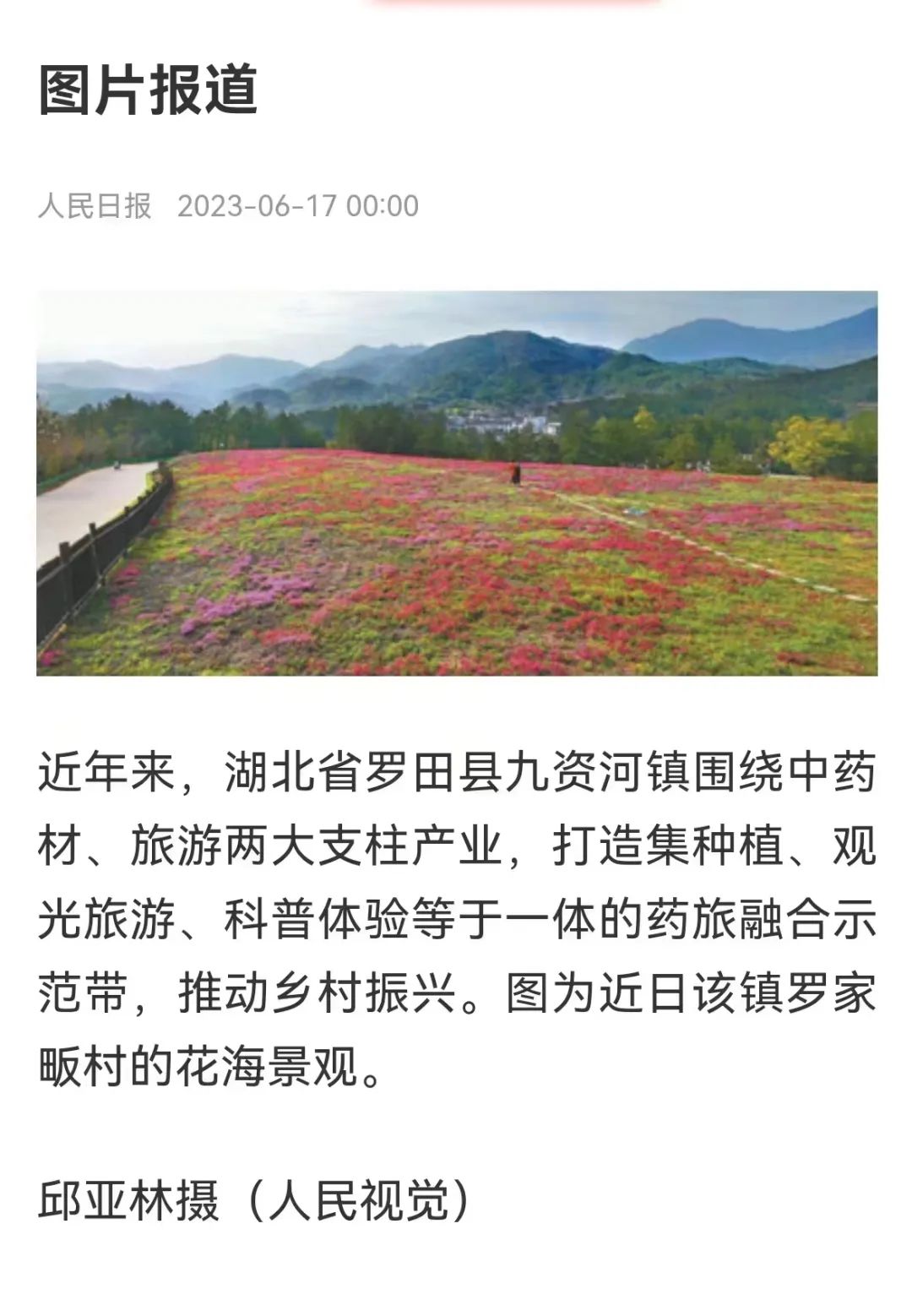 6月17日,《人民日报》头版刊发了一张精美的花海景观图。这张图引起了广泛关注,因为它来自湖北省罗田县九资河镇罗家畈村的一处药旅融合景观。