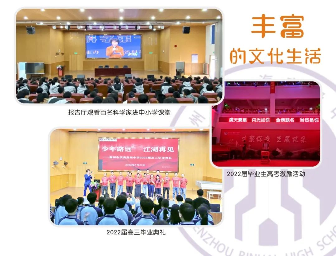 温州市滨海高级中学成立于2014年,位于国家级温州经济技术开发区(滨海十二路357号)。学校占地面积88亩,建筑面积51000平方米,总投资2.2亿元。学校东临甬莞高速,面向东海,环境幽静,校舍美观,布局合理,高楼林立,棕榈成荫,绿草如茵,桂花飘香。这是一个全新的校园。校内教学设施齐全,配套设施一流。教学区、生活区、活动区相对独立,配备了可容纳158个教室的教学楼、580座的报告厅、70座的演讲厅和300座的图书馆。这些设施为师生提供了良好的求知环境。理化生实验室配备规范,同学们可以动手操作,体验科学的魅力。4个专业画室、3个专业音乐室、钢琴室和舞蹈室等,开启了同学们艺术的殿堂。运动区内有九人制天然草坪足球场和两块五人制人工足球场、塑胶田径场和21×50米室内标准游泳馆等健身活动设施,气势恢宏,同学们可以一展雄姿,自由翱翔。“耕心堂”为师生提供“琴、棋、书、画”益智的社团活动场所。“雁荡园”里的滨高小公园、劳动实践基地、篮球馆、排球馆、羽毛球馆和体育场等场所,让师生在健身晨读中收获幸福和健康。学校采用全封闭寄宿制管理模式,生活区内学生公寓实行军事化管理,生活设施齐全,宿舍舒适宽敞。每间寝室定额6人,室内配有空调、独立卫生间、盥洗室和洗衣机等设施,满足了寄宿学生贵族生活的需求。学校现有24个教学班,在校学生近1000人。秉承“为多彩青春助力,为幸福人生奠基”的办学理念,滨高以“行正至善、学笃至臻”的校训,以“求实、求善、求美、求真”的校风,以“对人感恩、对已克制、对物珍惜、对事尽责”的师生行动指南,让滨高的学子们在“胸怀大爱、畅想大梦、培养大智、担当大任”中成长,在“常规理校、文化立校、质量兴校、特色强校”的办学目标中收获幸福和健康。多年的办学沉淀铸就了滨海高中独特的人文魅力。