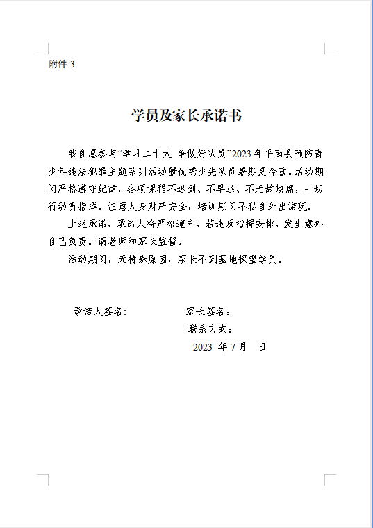 附:学员及家长承诺书、健康承诺书样式(将通过家长微信群发给大家):