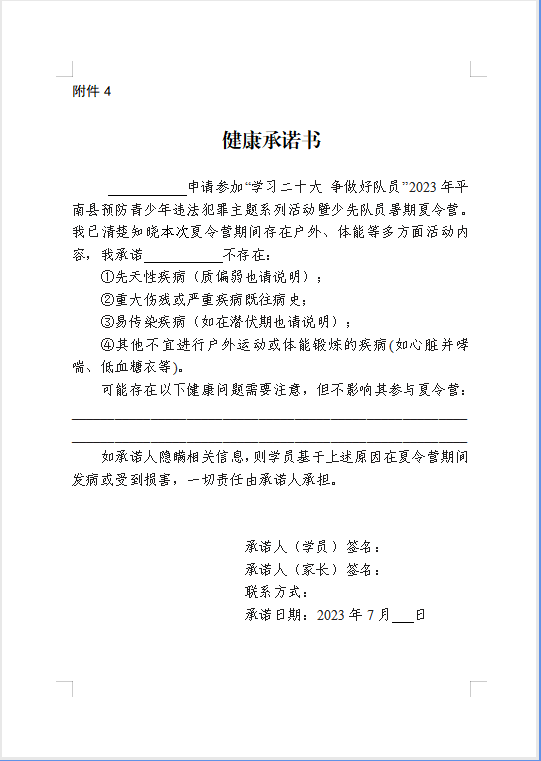 5.所有参加夏令营的学员和家长必须签署《学员及家长承诺书》和《健康承诺书》。请各位学员和家长自行打印《学员及家长承诺书》和《健康承诺书》(每份一式一份),并在报到时交到报到处。在活动期间,各学员需遵守纪律,听从主办方的指挥和安排。