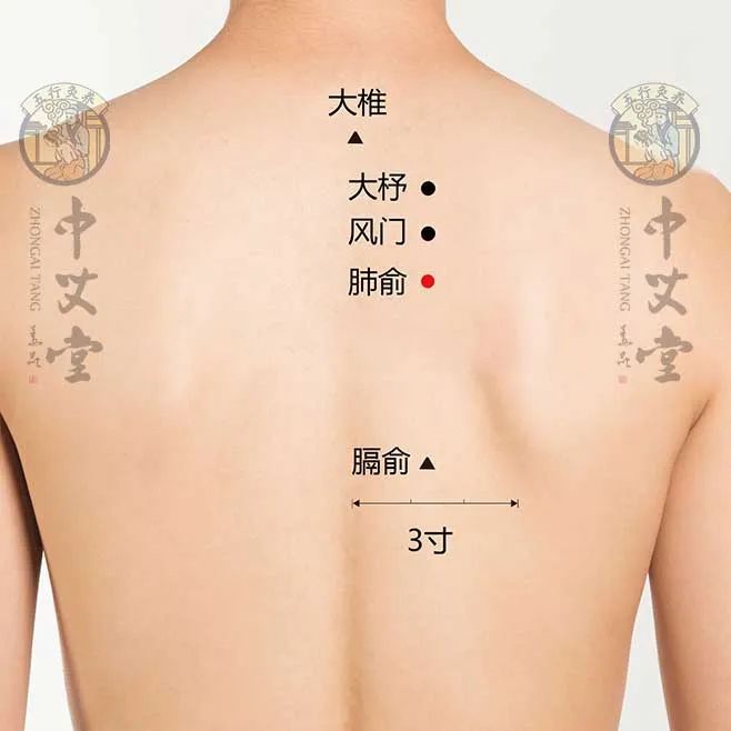 肺腧(双侧):位于背部,第3胸椎棘突下,后正中线旁开1.5寸处。主要用于治疗肺部疾病,如咳嗽、气喘、感冒等,能够调理肺气,疏风解表。