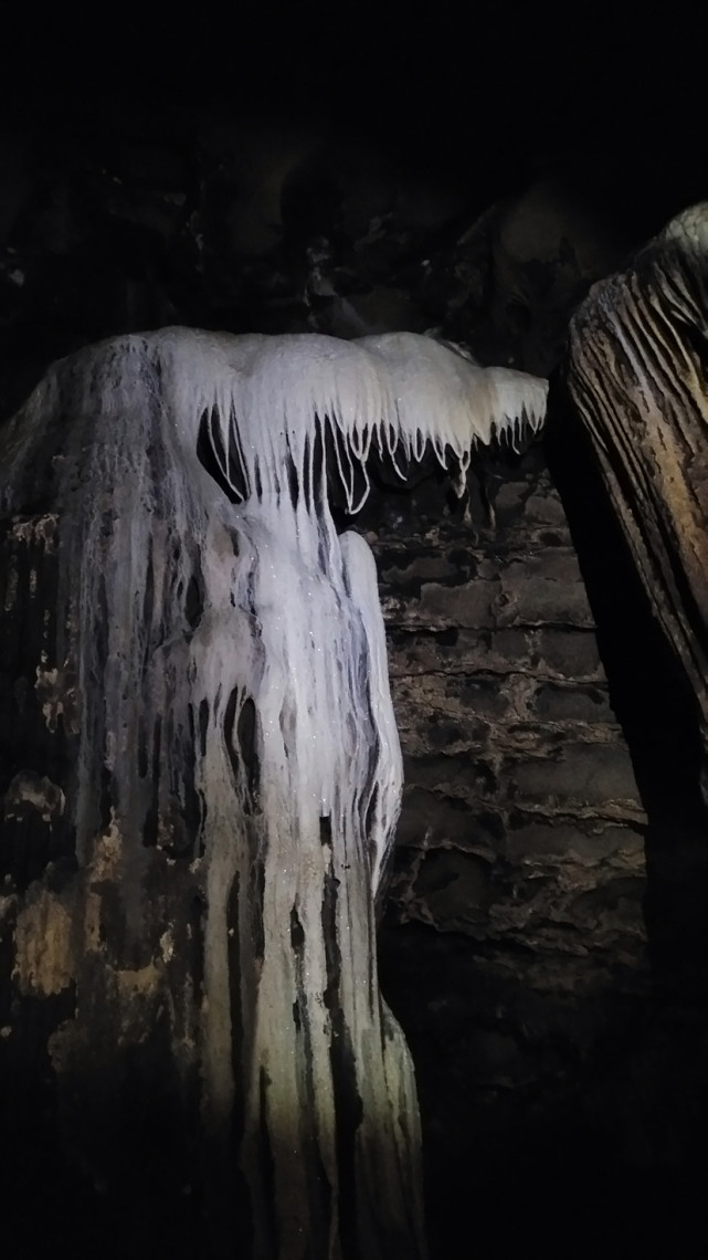 洞口看起来很普通,有点像农民的地窖,还留有人工挖掘的痕迹。进入洞口后,有一条斜穿地宫的通道,它幽深而潮湿。尽管有雪亮的灯光,但在没有反射条件的情况下,它显得苍白无力。我一直担心脚下会打滑摔倒,但导游告诉我,这个洞内长期没有阳光,不会长青苔,所以不会有打滑的危险。事实证明,我的确能感觉到鞋与地面之间的抓合力很强,所以不会有滑倒的危险。