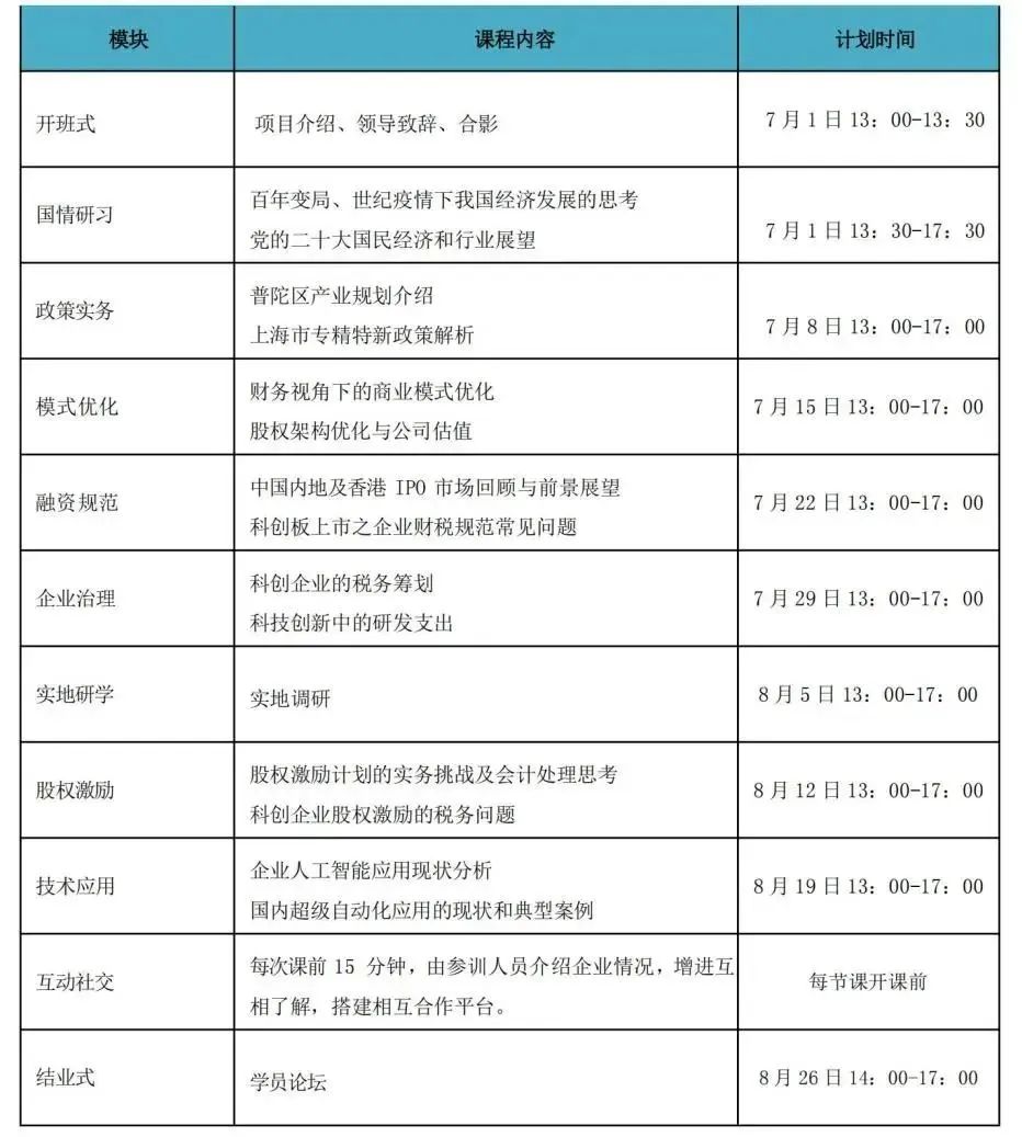 本期研修营将于2023年7月至8月每周六下午举行,届时将推出“政策实务”、“融资规范”、“股权激励”和“企业治理”等优质课程。此外,学员还将有机会走进相关领域头部企业进行现场学习。