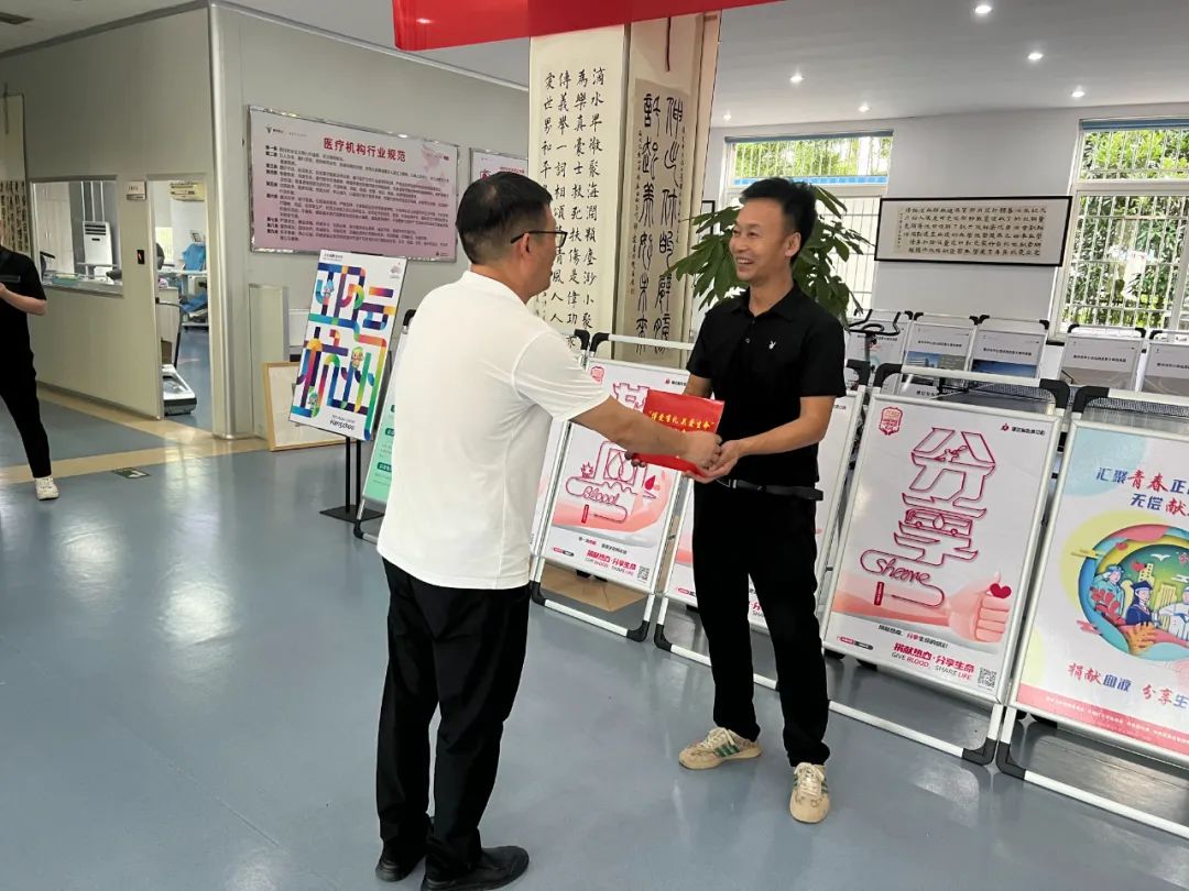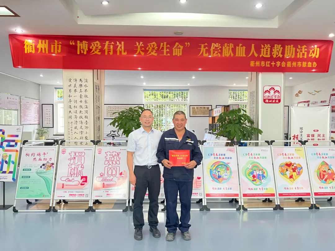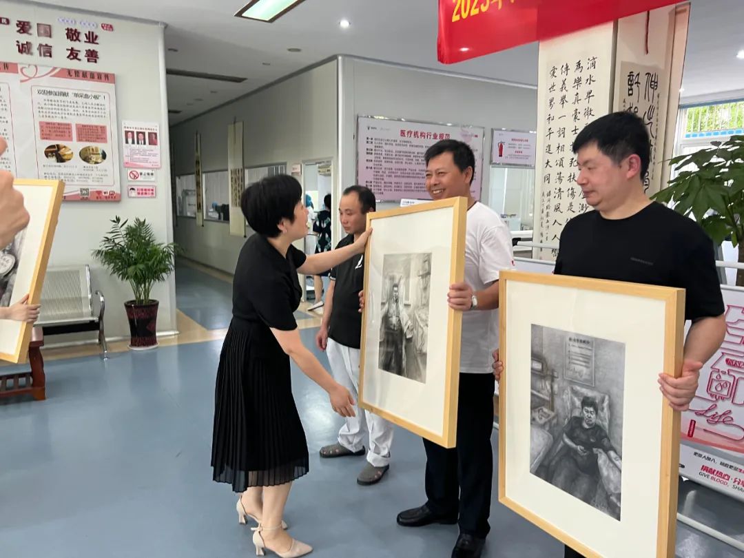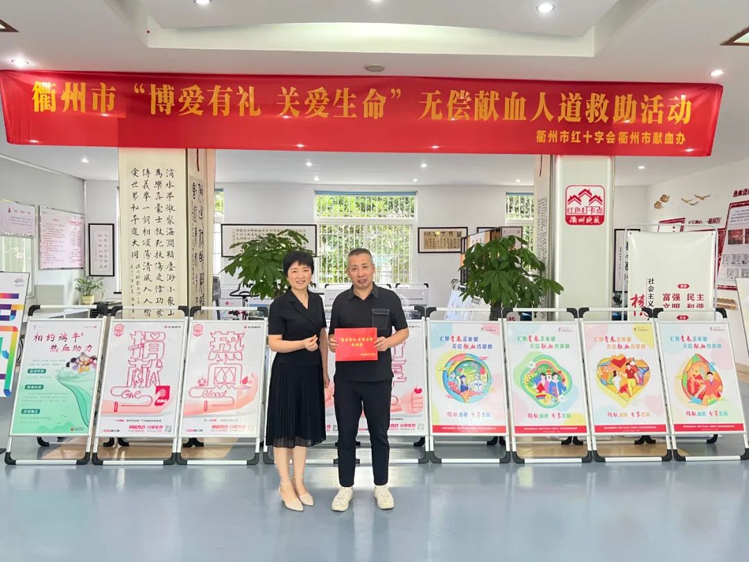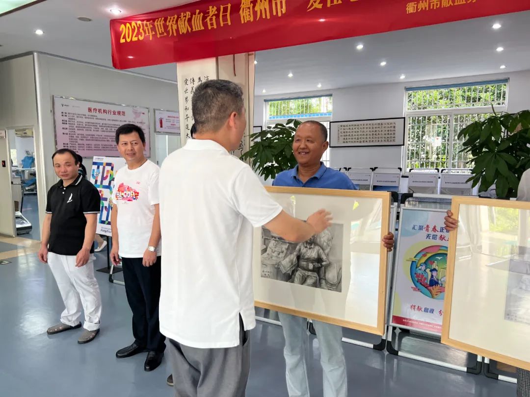 林敏,衢州高级中学党委副书记,艺术中心副主任袁良波以及市中心血站领导为2023年荣获“衢州市无偿献血香樟奖”“衢州市10万毫升献血英雄”“衢州市200次献血英雄”的无偿献血者们赠送了画像。
