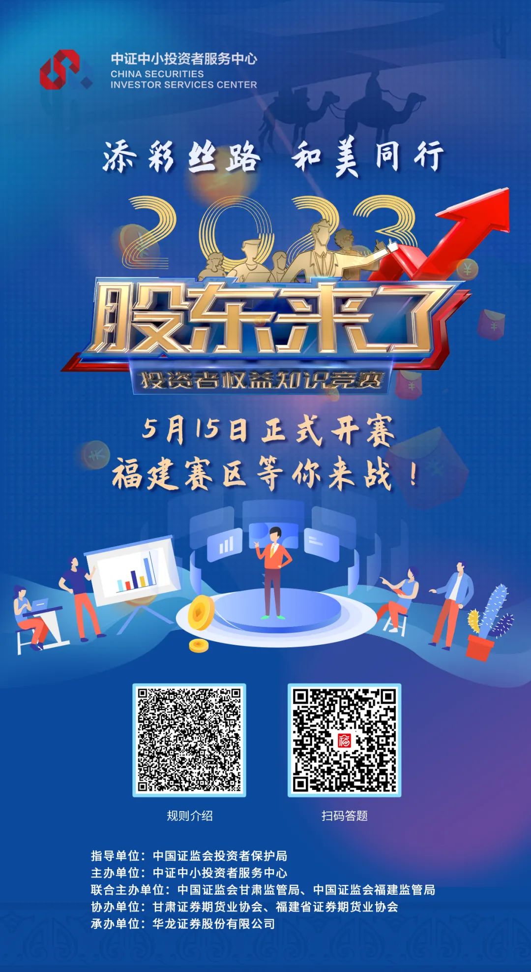 《股东来了》(2023)活动由中国证监会投资者保护局指导,中证中小投资者服务中心(简称投服中心)联合北京、浙江、甘肃、新疆四地证监局,以及芒果超媒和腾讯集团共同举办。本次活动将在福建地区设立分站,面向甘肃片区投资者开放。