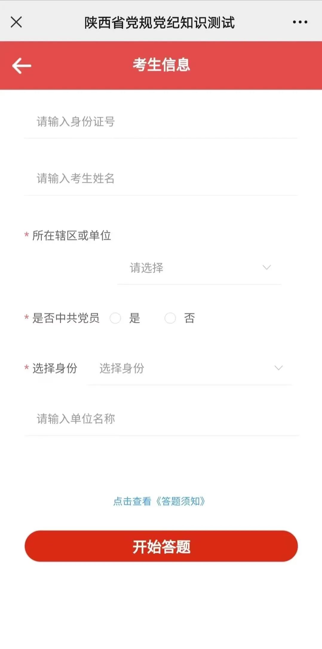 在正式答题前,请务必正确填写个人信息,然后点击开始答题。