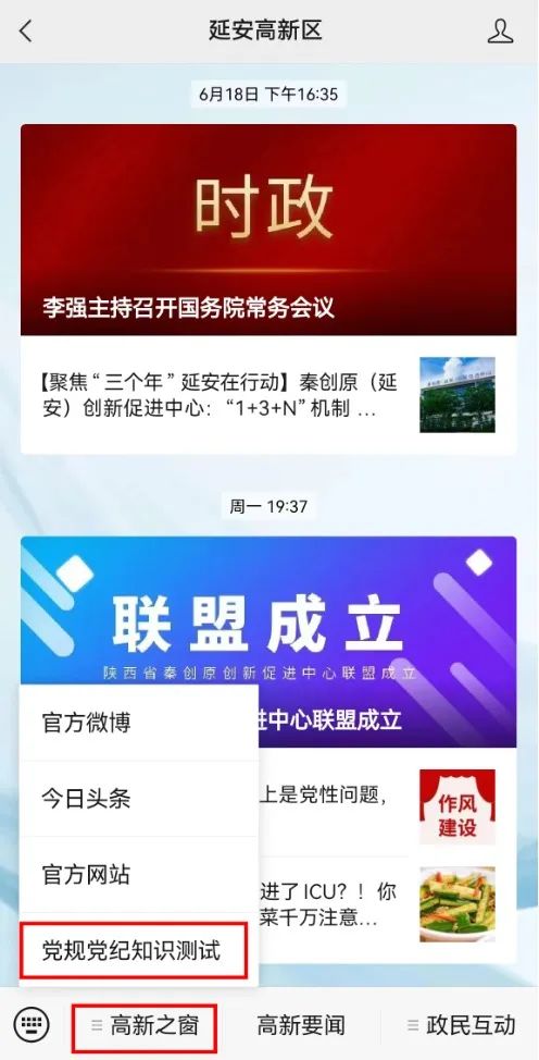 点击延安高新区微信公众号下方的“高新之窗”子菜单,找到“党规党纪知识测试”栏目,即可在线进行知识测试。