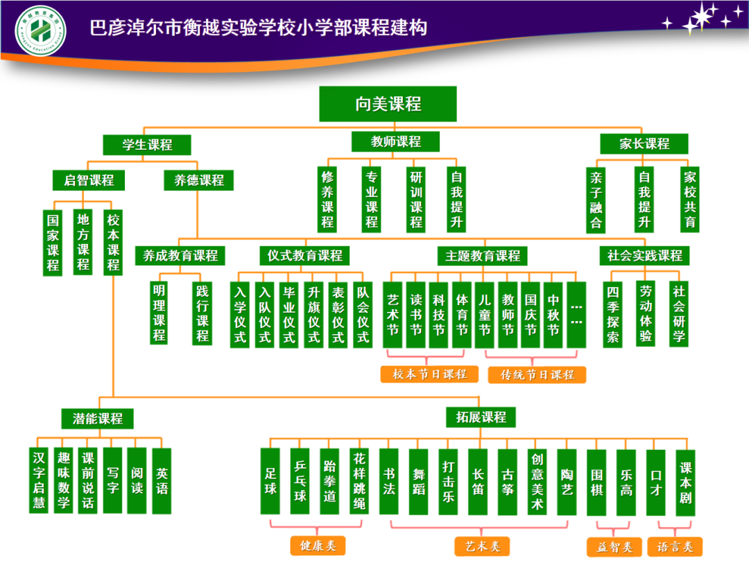 巴彦淖尔市衡越实验学校(小学部)是一所高起点、高标准、高品质的半寄宿制(午托管)小学。学校采用闭环式流程管理,注重过程“精”,追求结果“美”。小学部构建了以“尊重本色 展现亮色成就出色”为课程目标,完整且有体系的“向美”课程结构,并丰富了学科核心素养。